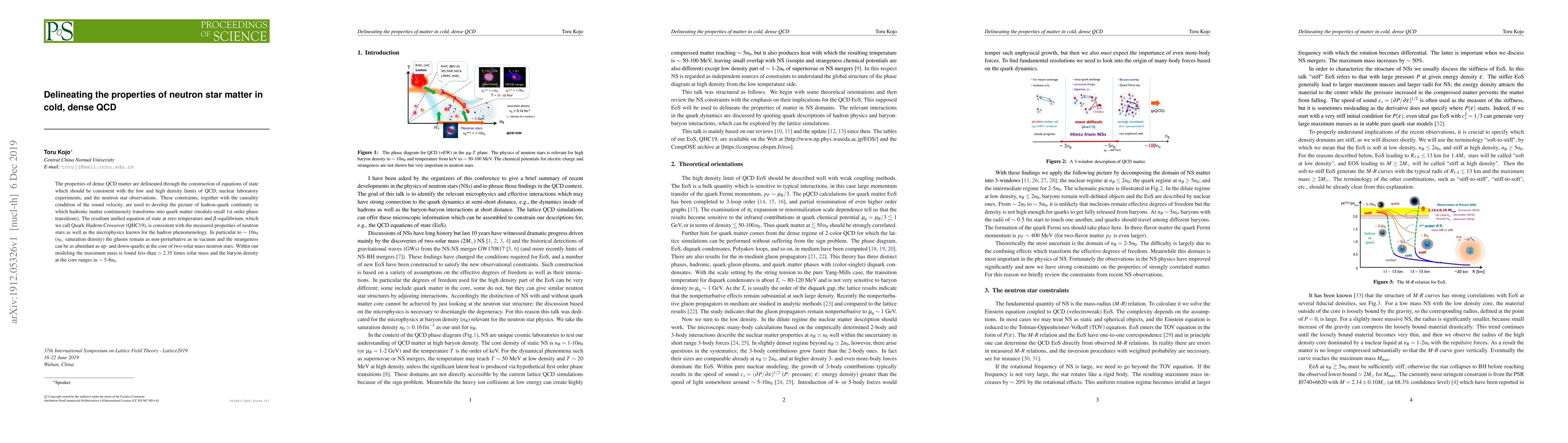 The properties of dense QCD matter are delineated through the construction of equations of state which should be consistent with the low and high density limits of QCD, nuclear laboratory experiments, and the neutron star observations. These constraints, together with the causality condition of the sound velocity, are used to develop the picture of hadron-quark continuity in which hadronic matter continuously transforms into quark matter (modulo small 1st order phase transitions). The resultant unified equation of state at zero temperature and $\beta$-equilibrium, which we call Quark-Hadron-Crossover (QHC19), is consistent with the measured properties of neutron stars as well as the microphysics known for the hadron phenomenology. In particular to $\sim 10n_0$ ($n_0$: saturation density) the gluons remain as non-perturbative as in vacuum and the strangeness can be as abundant as up- and down-quarks at the core of two-solar mass neutron stars. Within our modeling the maximum mass is found less than $\simeq 2.35$ times solar mass and the baryon density at the core ranges in $\sim 5$-8$n_0$.