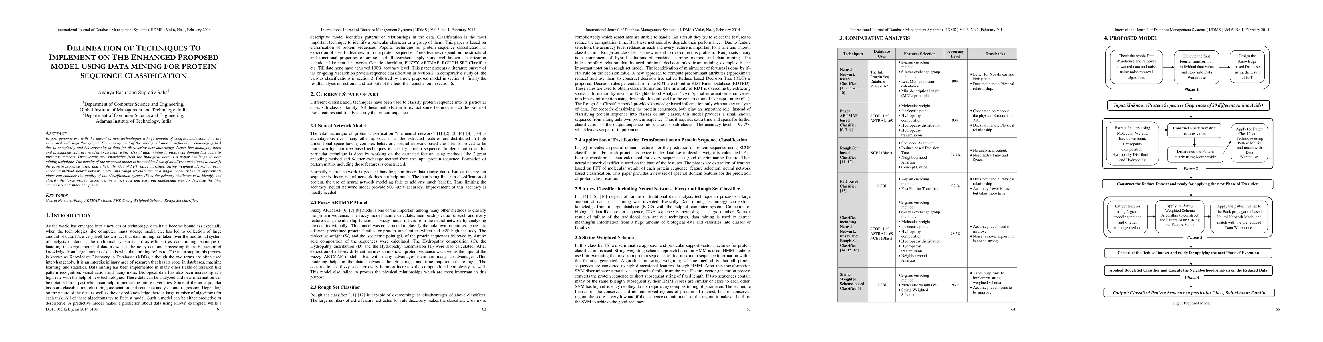 This paper proposes an enhanced model combining various data mining techniques—including FFT, fuzzy classifier, String weighted algorithm, gram encoding, neural network, and rough set classifier—to efficiently classify protein sequences. The aim is to manage complex, noisy, and incomplete biological data, reducing time and space complexity for protein sequence classification.