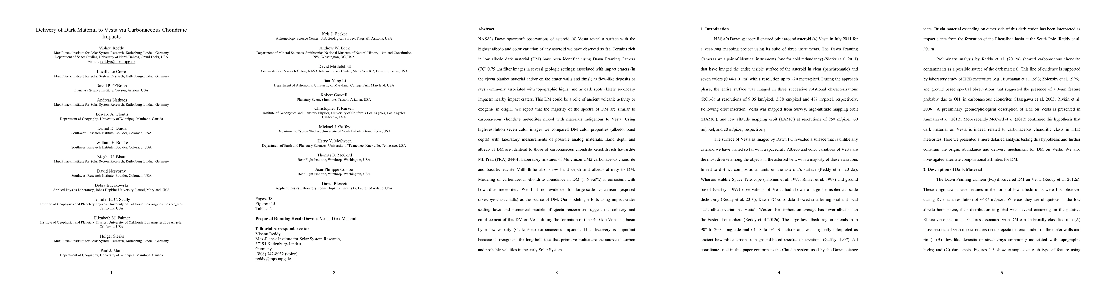 The Dawn spacecraft's observations of asteroid Vesta show that dark material (DM) is delivered via carbonaceous chondrite impacts, with spectra similar to Murchison meteorites mixed with Vestan materials, suggesting an exogenic origin rather than ancient volcanism.