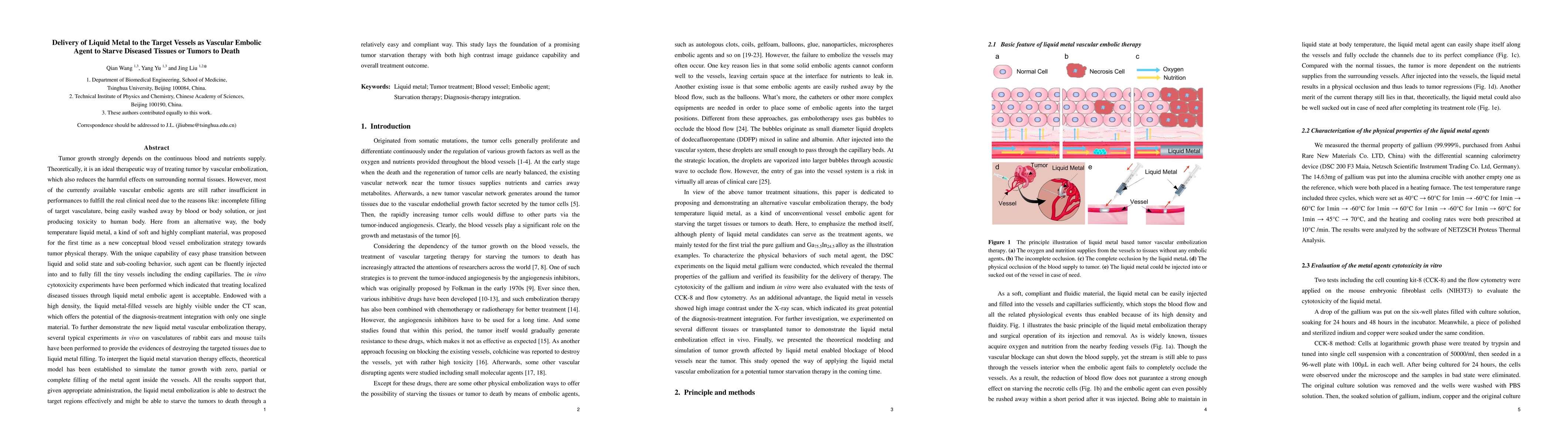 Tumor growth relies heavily on the continuous blood and nutrients supply. Theoretically, it is an ideal therapeutic way of killing tumor by only vascular embolization. However, most of the existing vascular embolic agents are still rather insufficient to fulfill the real clinical need due to the reasons like: incomplete filling of target vasculature, being easily washed away by blood or body solution, or just producing toxicity to tissues. Here from an alternative way, the body temperature liquid metal, a kind of soft and highly compliant material, was proposed for the first time as blood vessel embolization agent for tumor physical therapy. With its unique capability of easy phase transition between liquid and solid state and sub-cooling behavior, such material can be fluently injected into the tiny vessels including ending capillaries and fully block them. The in vitro cytotoxicity experiments were performed which showed that treating localized diseased tissues through liquid metal embolic agent is acceptable. Endowed with a high density, the liquid metal-filled vessels are highly visible under the CT scan, which offers the potential of diagnosis-treatment integration. To further demonstrate the new conceptual liquid metal vascular embolization therapy, several experiments on in vivo vasculatures of rabbit ears and mouse tails were performed to provide evidences of destroying the targeted tissues. To interpret the liquid metal starvation therapy effects, a theoretical model was established to simulate the tumor growth with zero, partial or complete filling of the metal agent inside the vessels. All the results support that, given appropriate administration, the liquid metal embolization is able to destruct the target regions and might starve the tumors to death through a relatively easy way. This study lays the foundation of a promising tumor starvation therapy in the coming time.