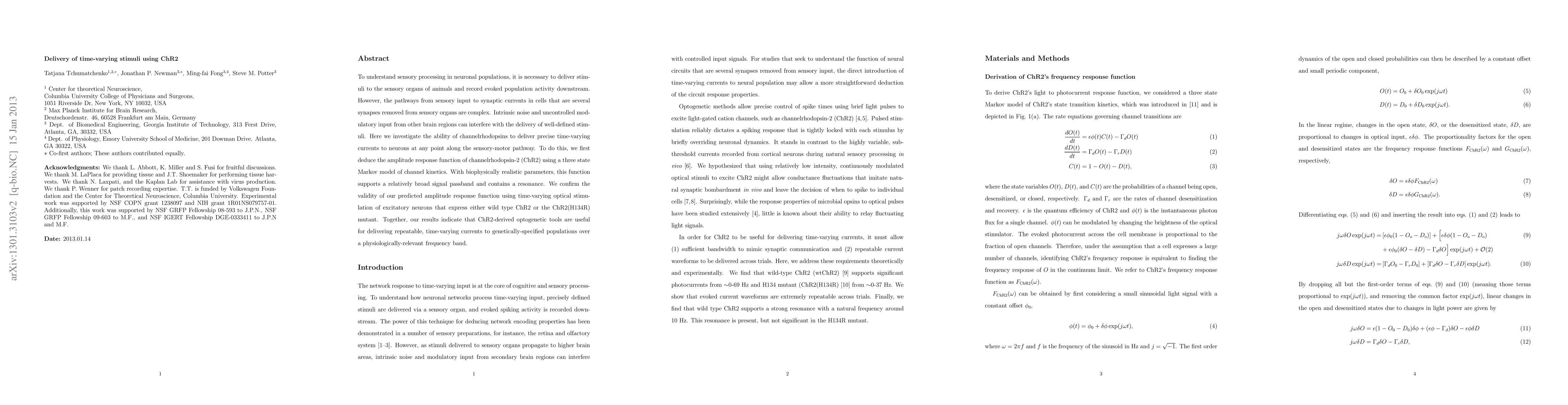 This paper investigates the use of channelrhodopsin-2 (ChR2) to deliver precise time-varying stimuli to neurons, confirming its effectiveness through a Markov model and optical stimulation experiments. The results suggest ChR2 is a reliable tool for optogenetic stimulation of specific neuronal populations over a physiologically relevant frequency range.