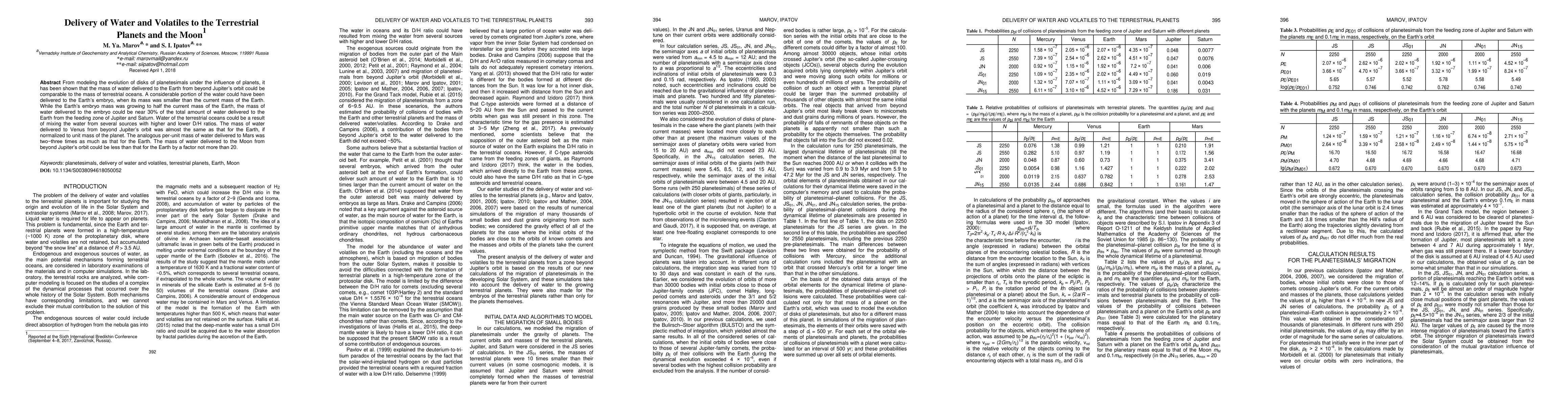 From modeling the evolution of disks of planetesimals under the influence of planets, it has been shown that the mass of water delivered to the Earth from beyond Jupiter's orbit could be comparable to the mass of terrestrial oceans. A considerable portion of the water could have been delivered to the Earth's embryo, when its mass was smaller than the current mass of the Earth. While the Earth's embryo mass was growing to half the current mass of the Earth, the mass of water delivered to the embryo could be near 30% of the total amount of water delivered to the Earth from the feeding zone of Jupiter and Saturn. Water of the terrestrial oceans could be a result of mixing the water from several sources with higher and lower D/H ratios. The mass of water delivered to Venus from beyond Jupiter's orbit was almost the same as that for the Earth, if normalized to unit mass of the planet. The analogous per-unit mass of water delivered to Mars was two-three times as much as that for the Earth. The mass of water delivered to the Moon from beyond Jupiter's orbit could be less than that for the Earth by a factor not more than 20.