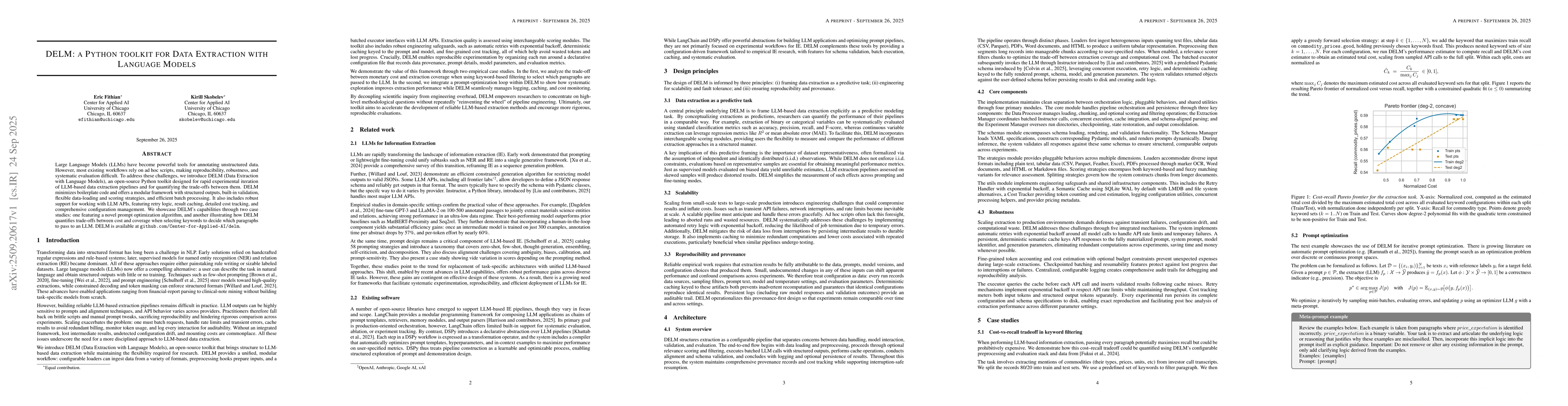 The research introduces DELM, a Python toolkit designed for data extraction using large language models (LLMs). It emphasizes reproducibility, systematic evaluation, and modular design. The methodology involves creating a configuration-driven framework with structured outputs, built-in validation, and efficient batch processing. The toolkit also integrates with LLM APIs, including retry logic, caching, and cost tracking.