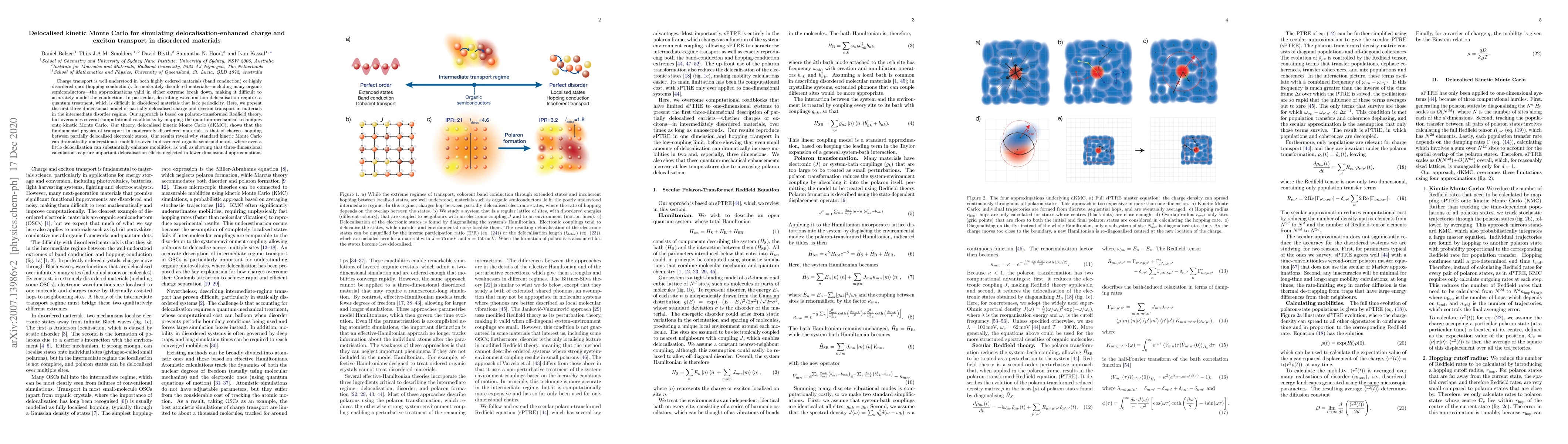 This paper introduces delocalised kinetic Monte Carlo (dKMC) to model charge and exciton transport in moderately disordered materials, demonstrating that enhanced mobilities in organic semiconductors arise from the hopping of charges between partially delocalised states, which standard kinetic Monte Carlo often underestimates.