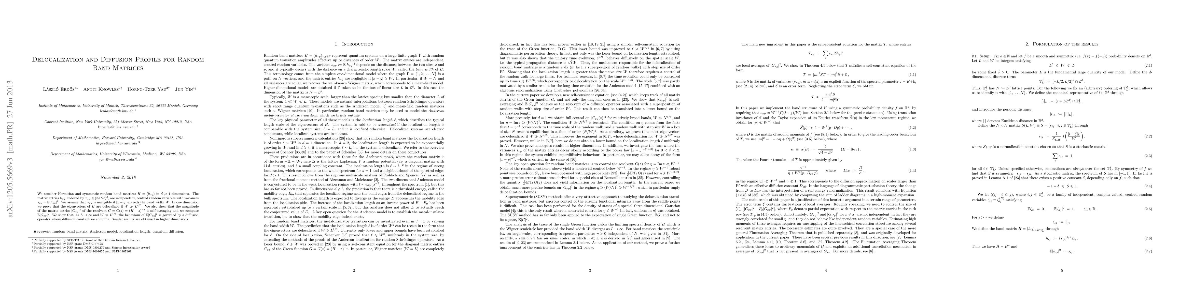 This paper investigates the delocalization of eigenvectors and diffusion profiles in random band matrices across dimensions. It demonstrates that in one dimension, eigenvectors are delocalized when the band width significantly exceeds a critical scaling of the matrix size, and it computes the diffusion constant governing the behavior of the matrix entries' magnitudes in the resolvent as the matrix size tends to infinity.