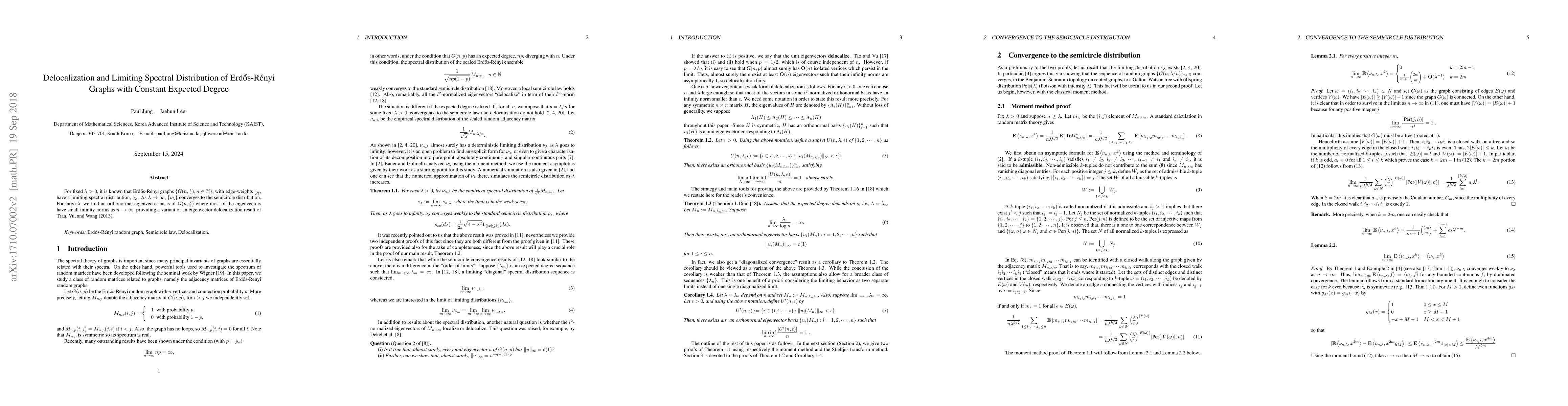 This paper investigates the spectral properties of Erdős-Rényi graphs with large constant expected degree, showing that edge weighting and scaling lead to a convergence of the limiting spectral distribution to a semicircle distribution. Additionally, it demonstrates that for large expected degrees, most eigenvectors delocalize in the infinity norm, extending prior delocalization results.