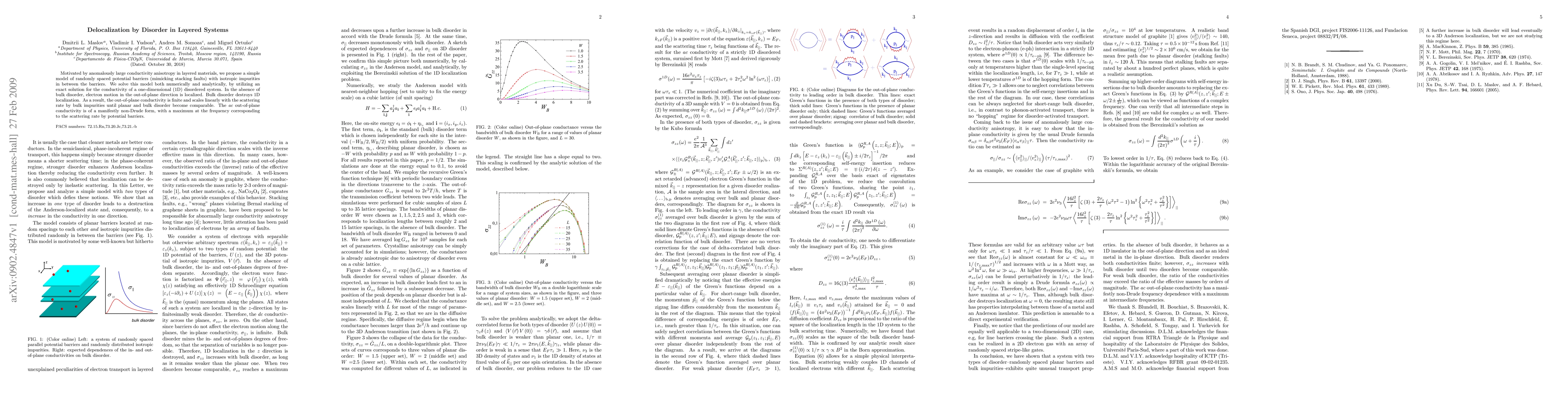 Motivated by anomalously large conductivity anisotropy in layered materials, we propose a simple model of randomly spaced potential barriers (mimicking stacking faults) with isotropic impurities in between the barriers. We solve this model both numerically and analytically, by utilizing an exact solution for the conductivity of a one-dimensional (1D) disordered system. In the absence of bulk disorder, electron motion in the out-of-plane direction is localized. Bulk disorder destroys 1D localization. As a result, the out-of-plane conductivity is finite and scales linearly with the scattering rate by bulk impurities until planar and bulk disorder become comparable. The \emph{ac} out-of-plane conductivity is of a manifestly non-Drude form, with a maximum at the frequency corresponding to the scattering rate by potential barriers.