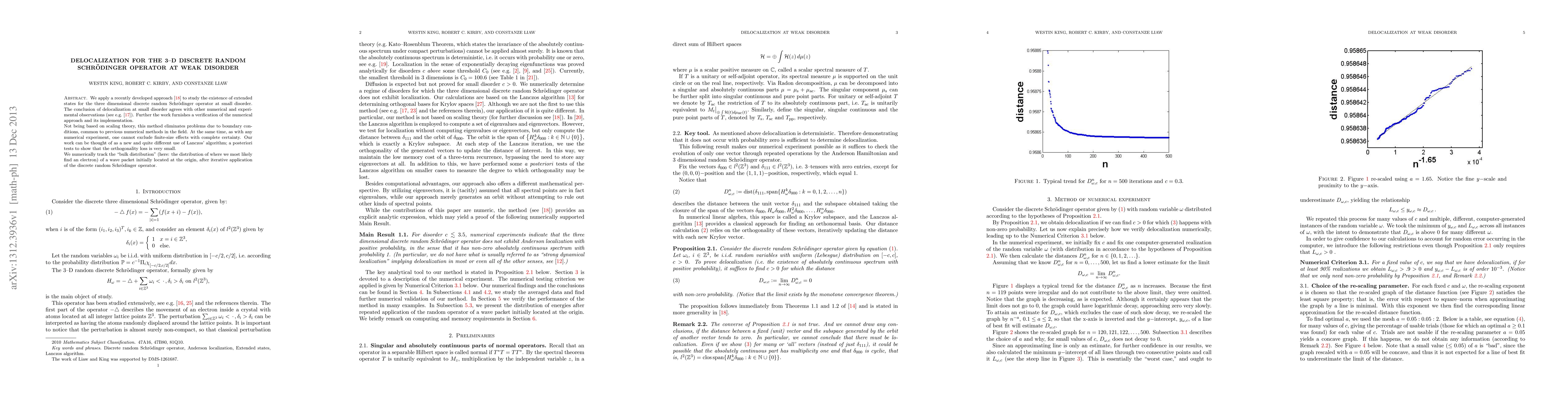 We apply a recently developed approach (Liaw 2013) to study the existence of extended states for the three dimensional discrete random Schroedinger operator at small disorder. The conclusion of delocalization at small disorder agrees with other numerical and experimental observations. Further the work furnishes a verification of the numerical approach and its implementation. Not being based on scaling theory, this method eliminates problems due to boundary conditions, common to previous numerical methods in the field. At the same time, as with any numerical experiment, one cannot exclude finite-size effects with complete certainty. Our work can be thought of as a new and quite different use of Lanczos' algorithm; a posteriori tests to show that the orthogonality loss is very small. We numerically track the "bulk distribution" (here: the distribution of where we most likely find an electron) of a wave packet initially located at the origin, after iterative application of the discrete random Schroedinger operator.