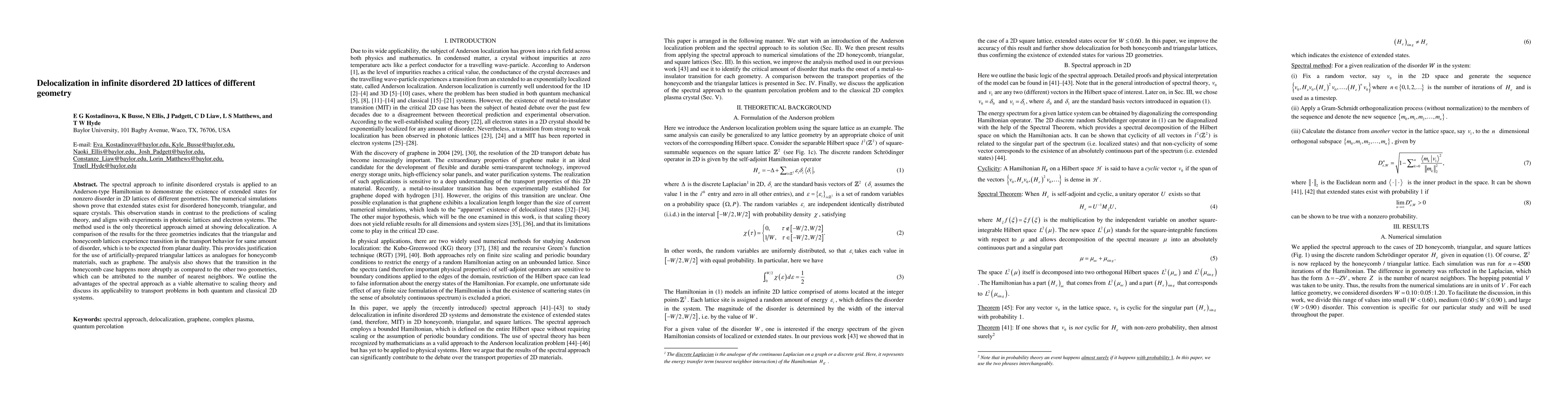 The spectral approach to infinite disordered crystals is applied to an Anderson-type Hamiltonian to demonstrate the existence of extended states for nonzero disorder in 2D lattices of different geometries. The numerical simulations shown prove that extended states exist for disordered honeycomb, triangular, and square crystals. This observation stands in contrast to the predictions of scaling theory, and aligns with experiments in photonic lattices and electron systems. The method used is the only theoretical approach aimed at showing delocalization. A comparison of the results for the three geometries indicates that the triangular and honeycomb lattices experience transition in the transport behavior for same amount of disorder, which is to be expected from planar duality. This provides justification for the use of artificially-prepared triangular lattices as analogues for honeycomb materials, such as graphene. The analysis also shows that the transition in the honeycomb case happens more abruptly as compared to the other two geometries, which can be attributed to the number of nearest neighbors. We outline the advantages of the spectral approach as a viable alternative to scaling theory and discuss its applicability to transport problems in both quantum and classical 2D systems.