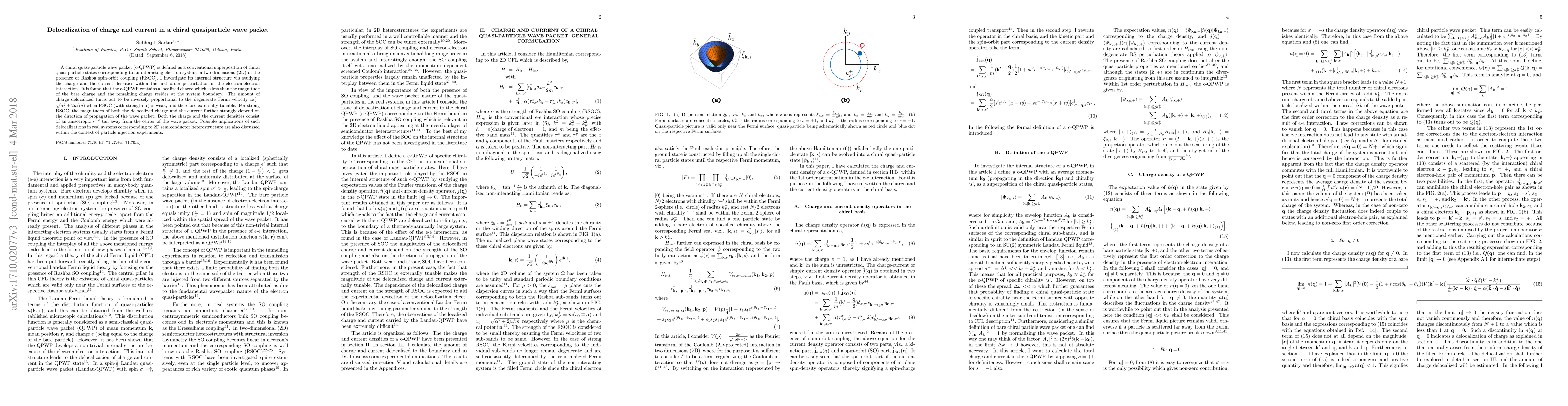 A chiral quasi-particle wave packet (c-QPWP) is defined as a conventional superposition of chiral quasi-particle states corresponding to an interacting electron system in two dimensions (2D) in the presence of Rashba spin-orbit coupling (RSOC). I investigate its internal structure via studying the charge and the current densities within the first order perturbation in the electron-electron interaction. It is found that the c-QPWP contains a localized charge which is less than the magnitude of the bare charge and the remaining charge resides at the system boundary. The amount of charge delocalized turns out to be inversely proportional to the degenerate Fermi velocity $v_0 ( = \sqrt{\alpha^2 + 2\mu / m})$ when RSOC (with strength $\alpha$) is weak, and therefore externally tunable. For strong RSOC, the magnitudes of both the delocalized charge and the current further strongly depend on the direction of propagation of the wave packet. Both the charge and the current densities consist of an anisotropic $r^{-2}$ tail away from the centre of the wave packet. Possible implications of such delocalizations in real systems corresponding to 2D semiconductor heterostructure are also discussed within the context of particle injection experiments.