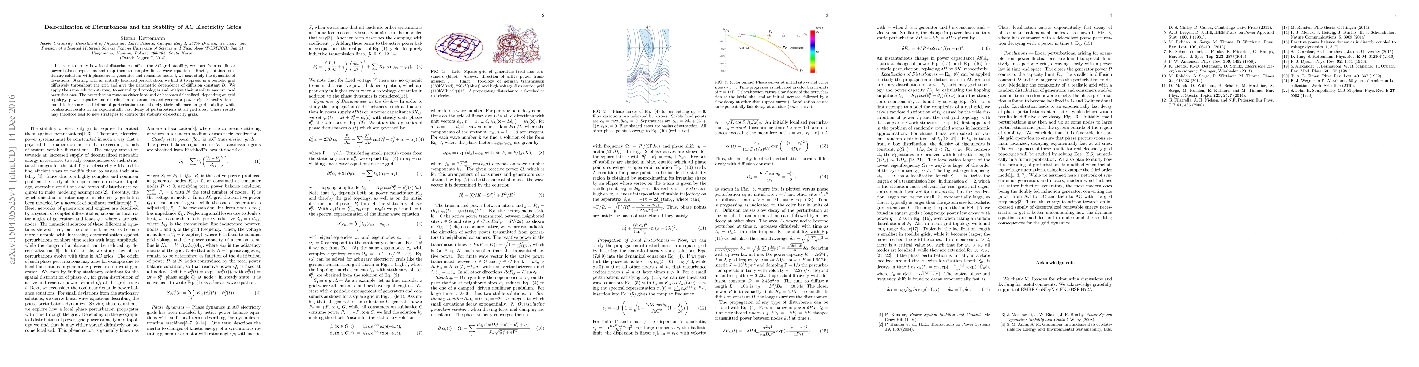 Researchers study how phase disturbances caused by local power fluctuations affect grid stability in AC electricity grids, finding that delocalization of these disturbances can increase their influence on grid stability.