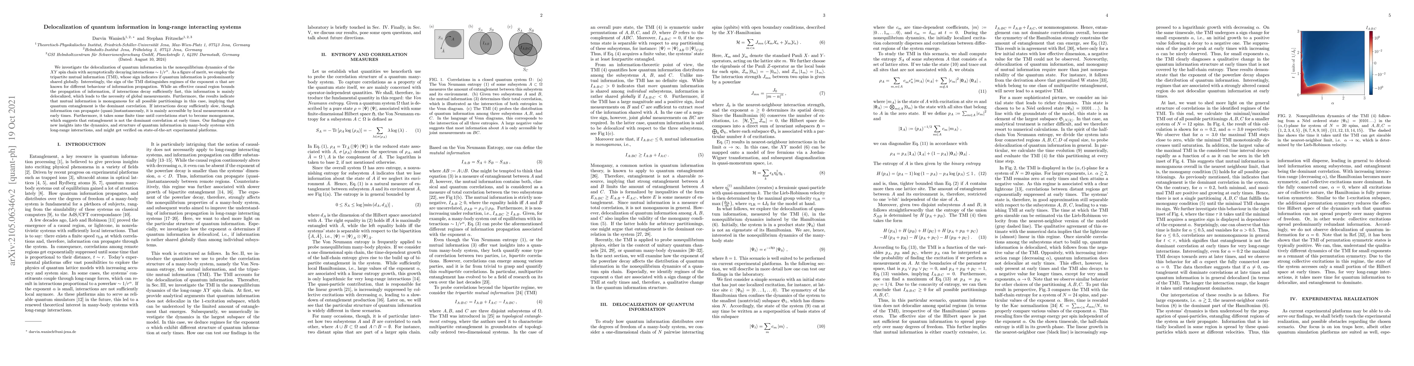 We investigate the delocalization of quantum information in the nonequilibrium dynamics of the $XY$ spin chain with asymptotically decaying interactions $\sim 1/r^{\alpha}$. As a figure of merit, we employ the tripartite mutual information (TMI), whose sign indicates if quantum information is predominantly shared globally. Interestingly, the sign of the TMI distinguishes regimes of the exponent $\alpha$ that are known for different behaviour of information propagation. While an effective causal region bounds the propagation of information, if interactions decay sufficiently fast, this information is mainly delocalized, which leads to the necessity of global measurements. Furthermore, the results indicate that mutual information is monogamous for all possible partitionings in this case, implying that quantum entanglement is the dominant correlation. If interactions decay sufficiently slow, though information can propagate (quasi-)instantaneously, it is mainly accessible by local measurements at early times. Furthermore, it takes some finite time until correlations start to become monogamous, which suggests that apart from entanglement, other nonmonogamous correlations are sizeable at early times. Our findings give new insights into the dynamics, and structure of quantum information in many-body systems with long-range interactions, and might get verified on state-of-the-art experimental platforms.