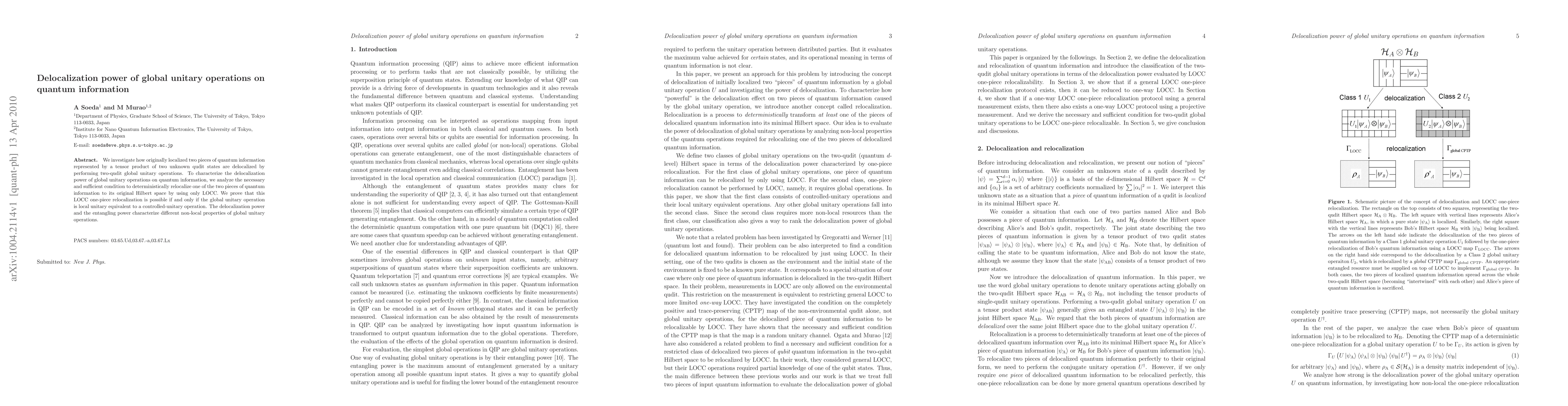 This paper explores how global unitary operations can delocalize two initially localized quantum information pieces, and it determines the conditions under which one piece can be relocalized using local operations and classical communication (LOCC). It concludes that such relocalization is feasible only if the global unitary operation is equivalent to a controlled-unitary operation.