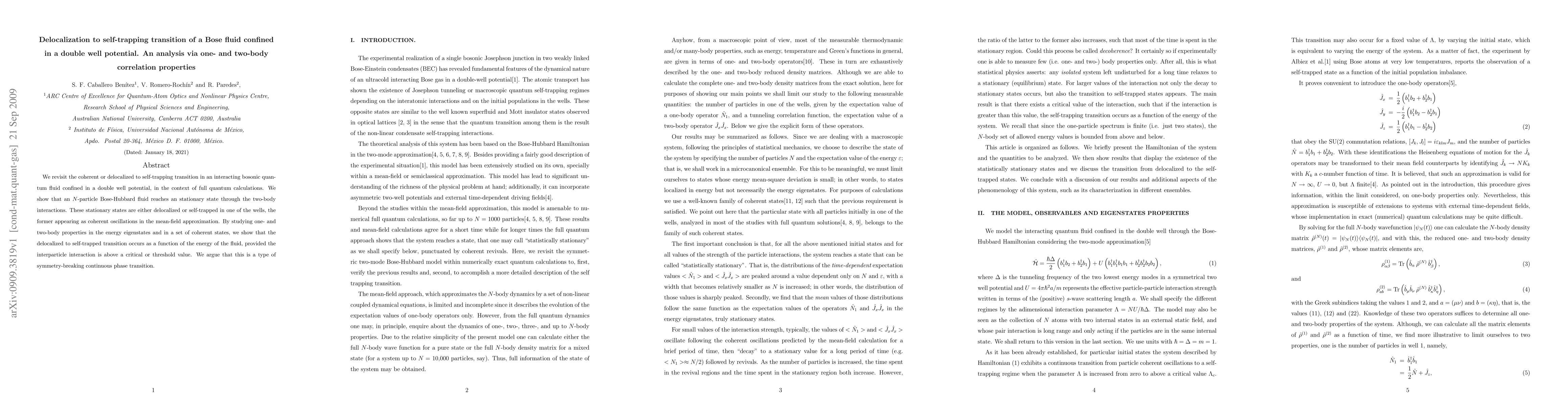 We revisit the coherent or delocalized to self-trapping transition in an interacting bosonic quantum fluid confined in a double well potential, in the context of full quantum calculations. We show that an $N$-particle Bose-Hubbard fluid reaches an stationary state through the two-body interactions. These stationary states are either delocalized or self-trapped in one of the wells, the former appearing as coherent oscillations in the mean-field approximation. By studying one- and two-body properties in the energy eigenstates and in a set of coherent states, we show that the delocalized to self-trapped transition occurs as a function of the energy of the fluid, provided the interparticle interaction is above a critical or threshold value. We argue that this is a type of symmetry-breaking continuous phase transition.