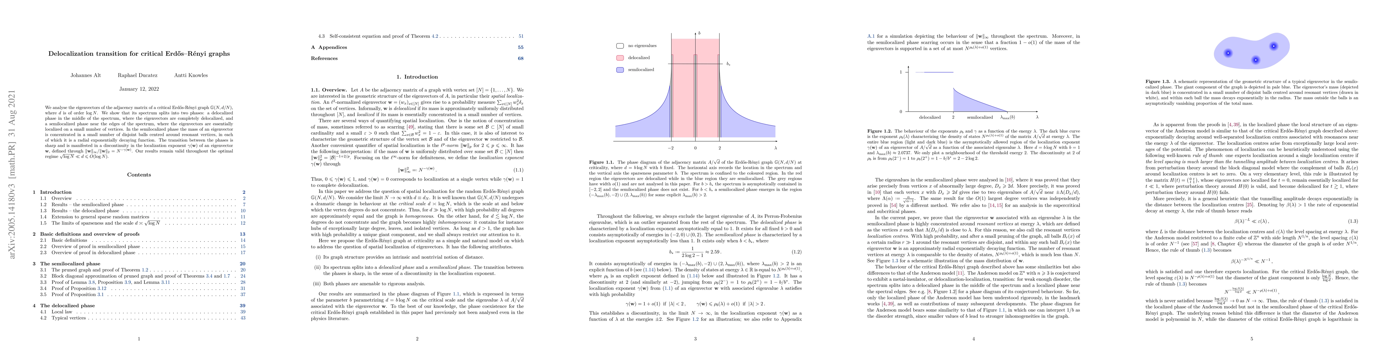 Researchers studied the eigenvectors of critical Erdøs-Rényi graphs, finding two phases: a delocalized phase with completely spread-out vectors, and a semilocalized phase where vectors are localized on a few vertices, with a sharp transition between the phases.