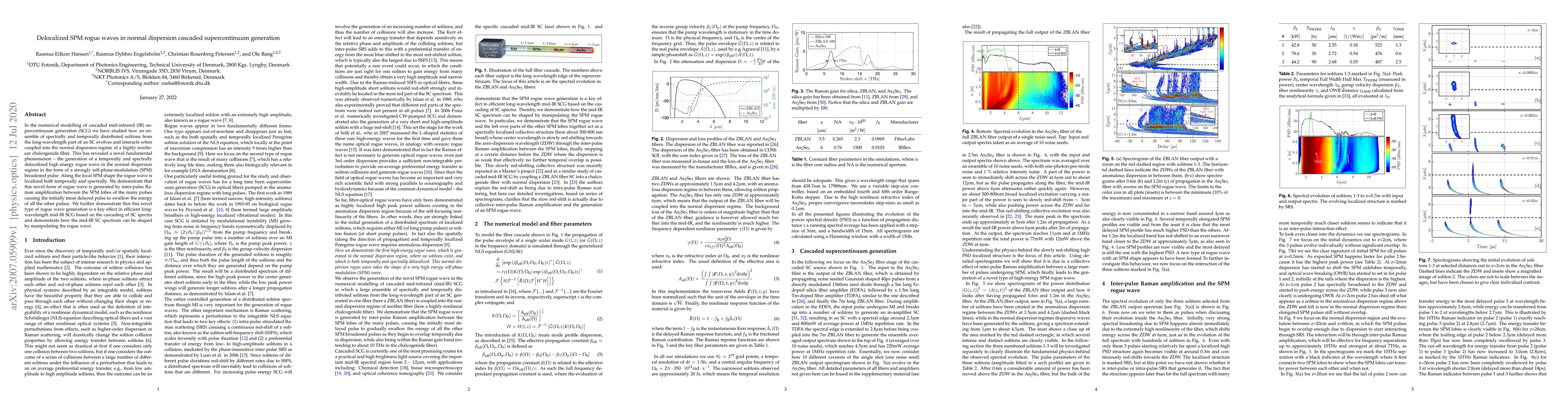 In the numerical modelling of cascaded mid-infrared (IR) supercontinuum generation (SCG) we have studied how an ensemble of spectrally and temporally distributed solitons from the long-wavelength part of an SC evolves and interacts when coupled into the normal dispersion regime of a highly nonlinear chalcogenide fiber. This has revealed a novel fundamental phenomenon - the generation of a temporally and spectrally delocalized high energy rogue wave in the normal dispersion regime in the form of a strongly self-phase-modulation (SPM) broadened pulse. Along the local SPM shape the rogue wave is localized both temporally and spectrally. We demonstrate that this novel form of rogue wave is generated by inter-pulse Raman amplification between the SPM lobes of the many pulses causing the initially most delayed pulse to swallow the energy of all the other pulses. We further demonstrate that this novel type of rogue wave generation is a key effect in efficient long-wavelength mid-IR SCG based on the cascading of SC spectra and demonstrate how the mid-IR SC spectrum can be shaped by manipulating the rogue wave.