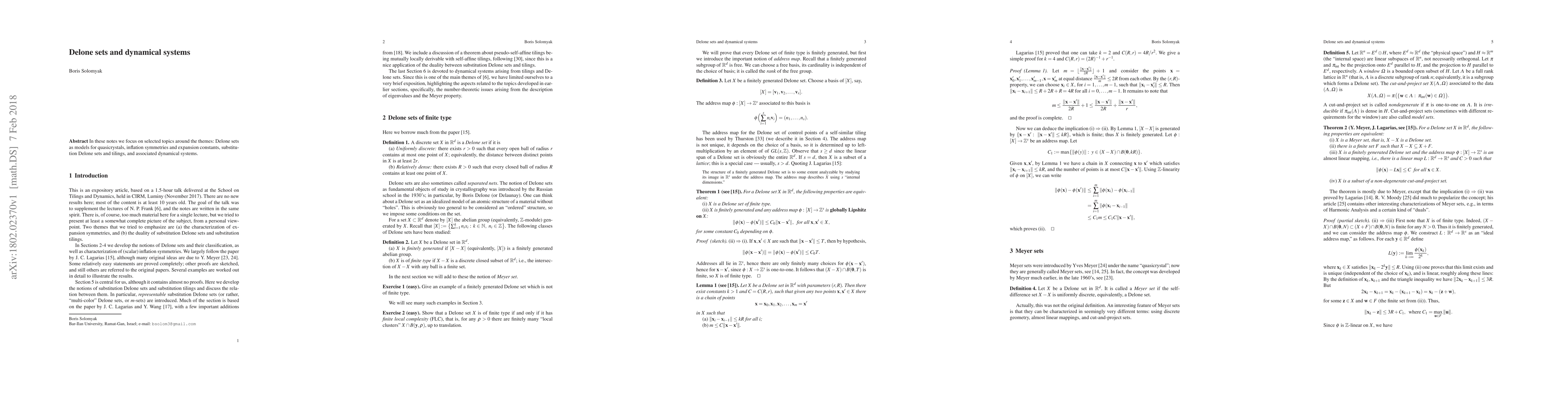 Summary: This paper explores Delone sets as mathematical models for quasicrystals, examining their inflation symmetries, expansion constants, and connections to substitution Delone sets and tilings, along with their associated dynamical systems.
