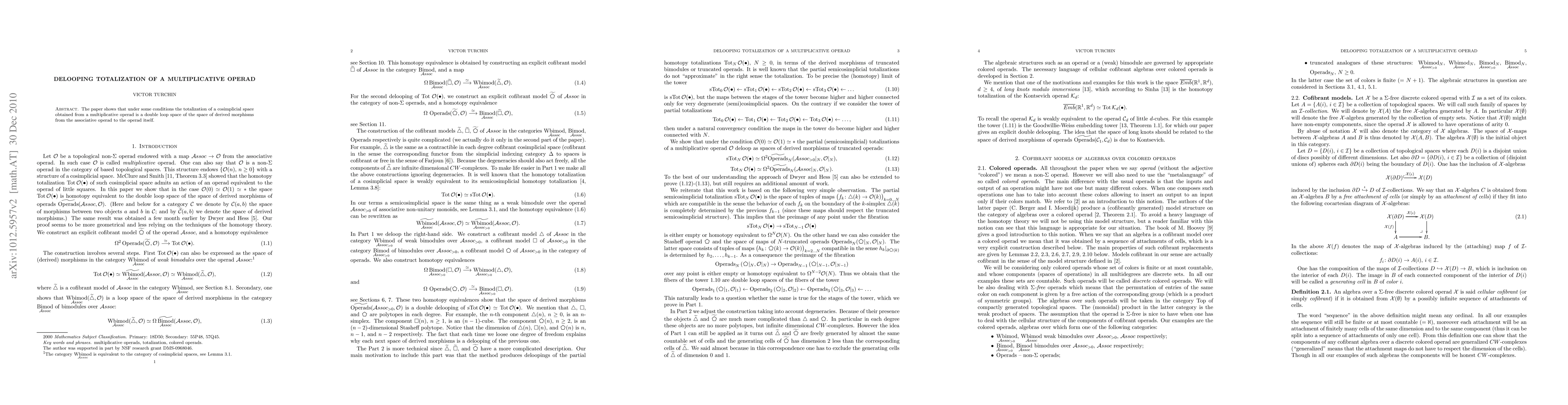 The paper shows that under some conditions the totalization of a cosimplicial space obtained from a multiplicative operad is a double loop space of the space of derived morphisms from the associative operad to the operad itself.