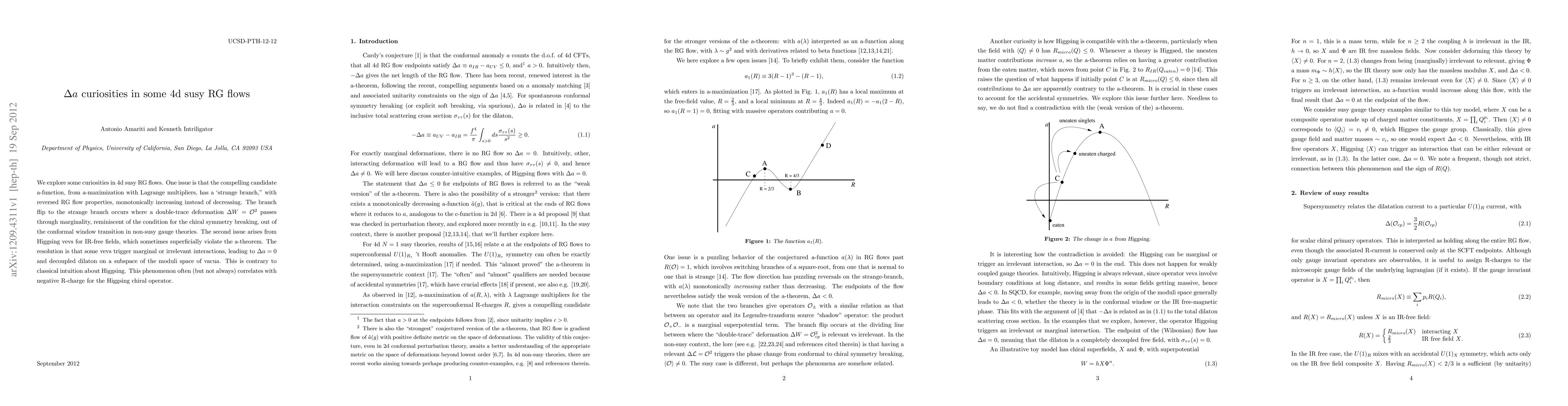 We explore some curiosities in 4d susy RG flows. One issue is that the compelling candidate a-function, from a-maximization with Lagrange multipliers, has a `strange branch," with reversed RG flow properties, monotonically increasing instead of decreasing. The branch flip to the strange branch occurs where a double-trace deformation Delta W=O ^2 passes through marginality, reminiscent of the condition for the chiral symmetry breaking, out of the conformal window transition in non-susy gauge theories. The second issue arises from Higgsing vevs for IR-free fields, which sometimes superficially violate the a-theorem. The resolution is that some vevs trigger marginal or irrelevant interactions, leading to Delta a=0 and decoupled dilaton on a subspace of the moduli space of vacua. This is contrary to classical intuition about Higgsing. This phenomenon often (but not always) correlates with negative R-charge for the Higgsing chiral operator.