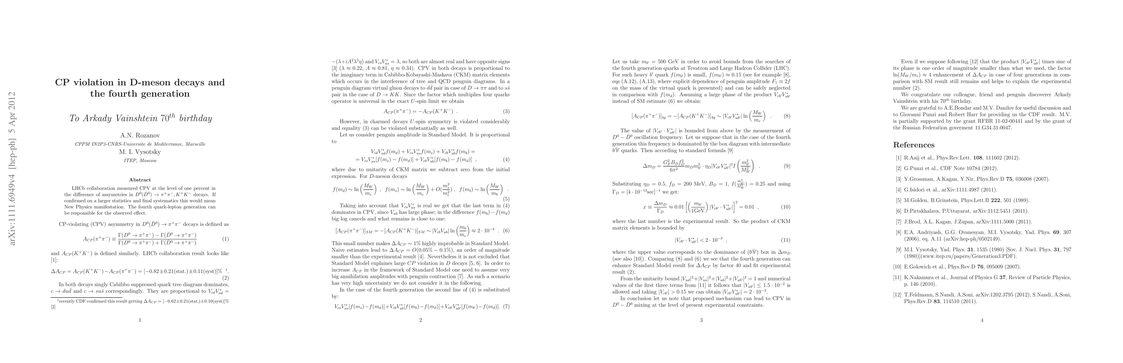 LHCb collaboration measured CPV at the level of one percent in the difference of assymetries in $D^0(\bar D^0)\to \pi^+ \pi^-, K^+ K^-$ decays. If confirmed on a larger statistics and final systematics this would mean New Physics manifestation. The fourth quark-lepton generation can be responsible for the observed effect.