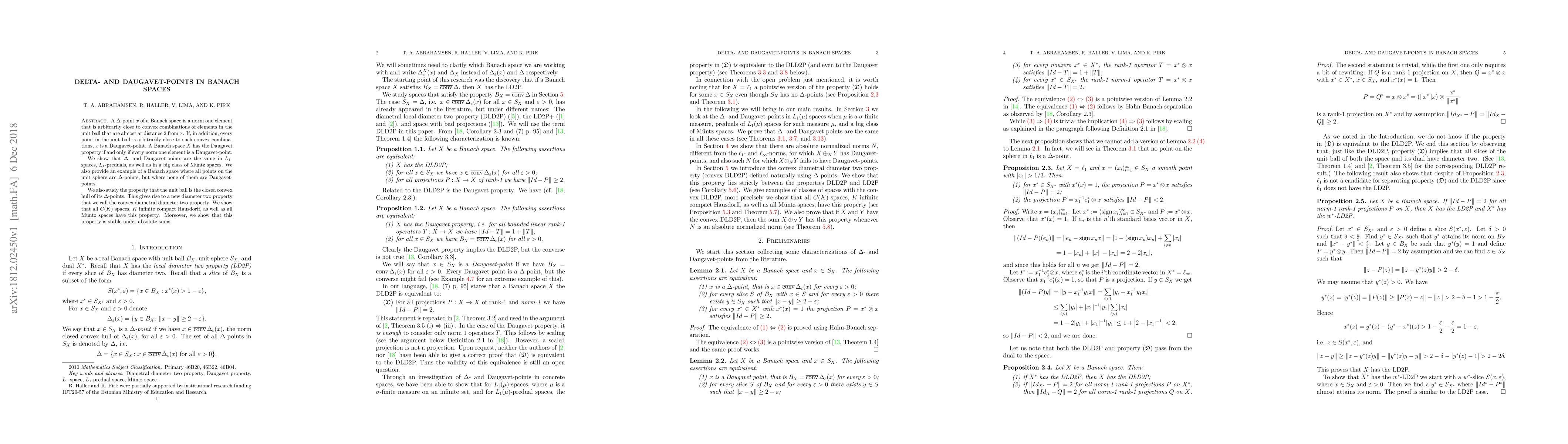 This paper investigates $\Delta$- and Daugavet-points in Banach spaces, demonstrating they coincide in $L_1$-spaces, $L_1$-preduals, and certain M\"untz spaces. It also presents a Banach space where all unit sphere points are $\Delta$-points but none are Daugavet-points, and explores the convex diametral diameter two property, showing it holds for $C(K)$ spaces and M\"untz spaces and is stable under absolute sums.