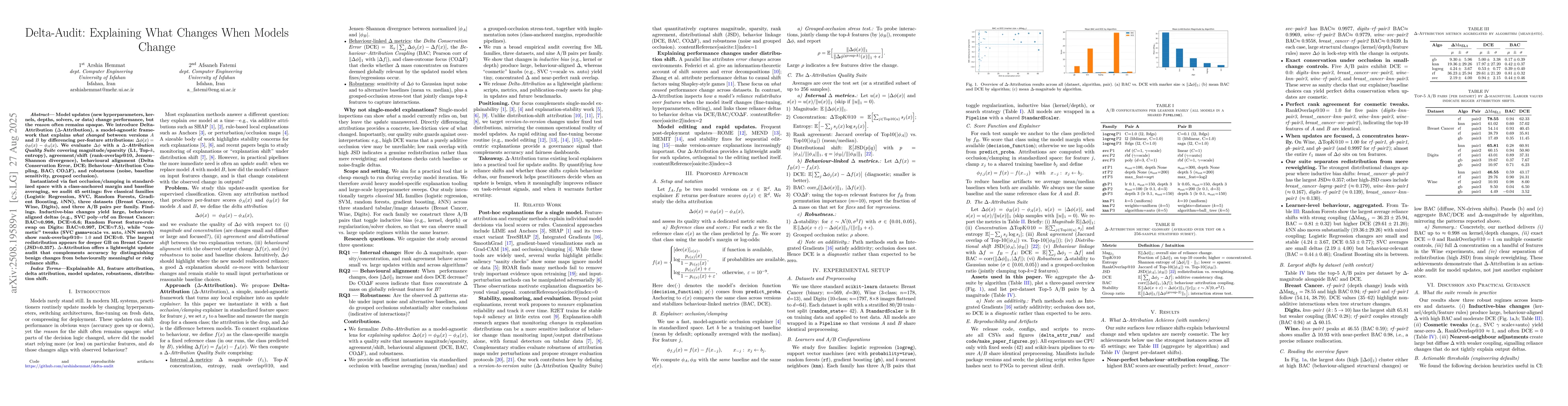 Model updates (new hyperparameters, kernels, depths, solvers, or data) change performance, but the \emph{reason} often remains opaque. We introduce \textbf{Delta-Attribution} (\mbox{$\Delta$-Attribution}), a model-agnostic framework that explains \emph{what changed} between versions $A$ and $B$ by differencing per-feature attributions: $\Delta\phi(x)=\phi_B(x)-\phi_A(x)$. We evaluate $\Delta\phi$ with a \emph{$\Delta$-Attribution Quality Suite} covering magnitude/sparsity (L1, Top-$k$, entropy), agreement/shift (rank-overlap@10, Jensen--Shannon divergence), behavioural alignment (Delta Conservation Error, DCE; Behaviour--Attribution Coupling, BAC; CO$\Delta$F), and robustness (noise, baseline sensitivity, grouped occlusion). Instantiated via fast occlusion/clamping in standardized space with a class-anchored margin and baseline averaging, we audit 45 settings: five classical families (Logistic Regression, SVC, Random Forests, Gradient Boosting, $k$NN), three datasets (Breast Cancer, Wine, Digits), and three A/B pairs per family. \textbf{Findings.} Inductive-bias changes yield large, behaviour-aligned deltas (e.g., SVC poly$\!\rightarrow$rbf on Breast Cancer: BAC$\approx$0.998, DCE$\approx$6.6; Random Forest feature-rule swap on Digits: BAC$\approx$0.997, DCE$\approx$7.5), while ``cosmetic'' tweaks (SVC \texttt{gamma=scale} vs.\ \texttt{auto}, $k$NN search) show rank-overlap@10$=1.0$ and DCE$\approx$0. The largest redistribution appears for deeper GB on Breast Cancer (JSD$\approx$0.357). $\Delta$-Attribution offers a lightweight update audit that complements accuracy by distinguishing benign changes from behaviourally meaningful or risky reliance shifts.