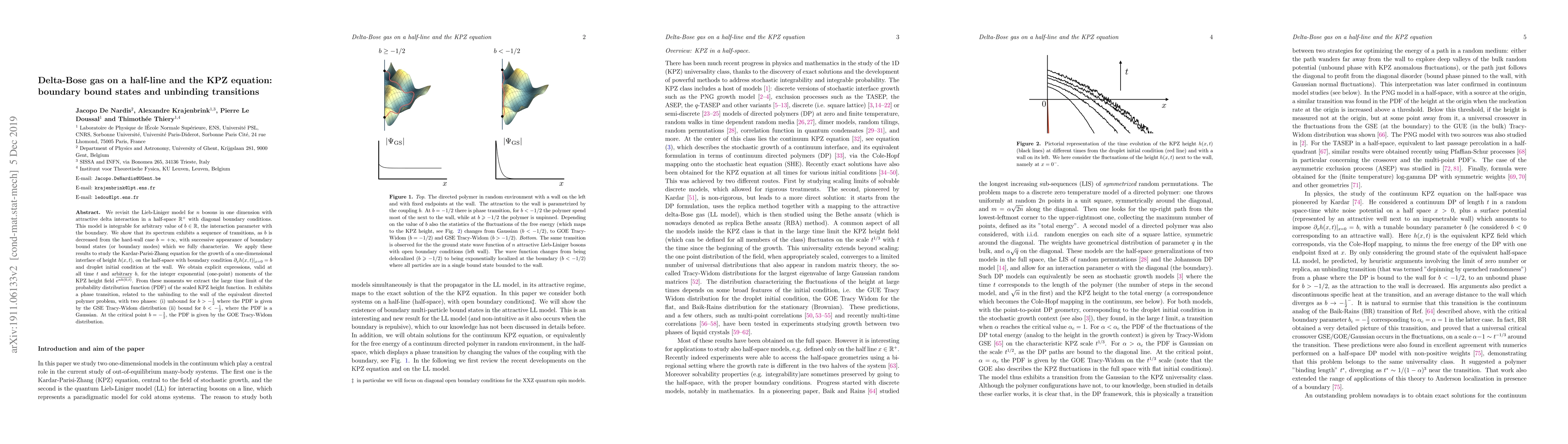 This study analyzes a specific model for bosons in one dimension with attractive delta interaction on a half-line, finding transitions in its spectrum that affect the Kardar-Parisi-Zhang equation's growth pattern, leading to different probability distribution functions at critical points.