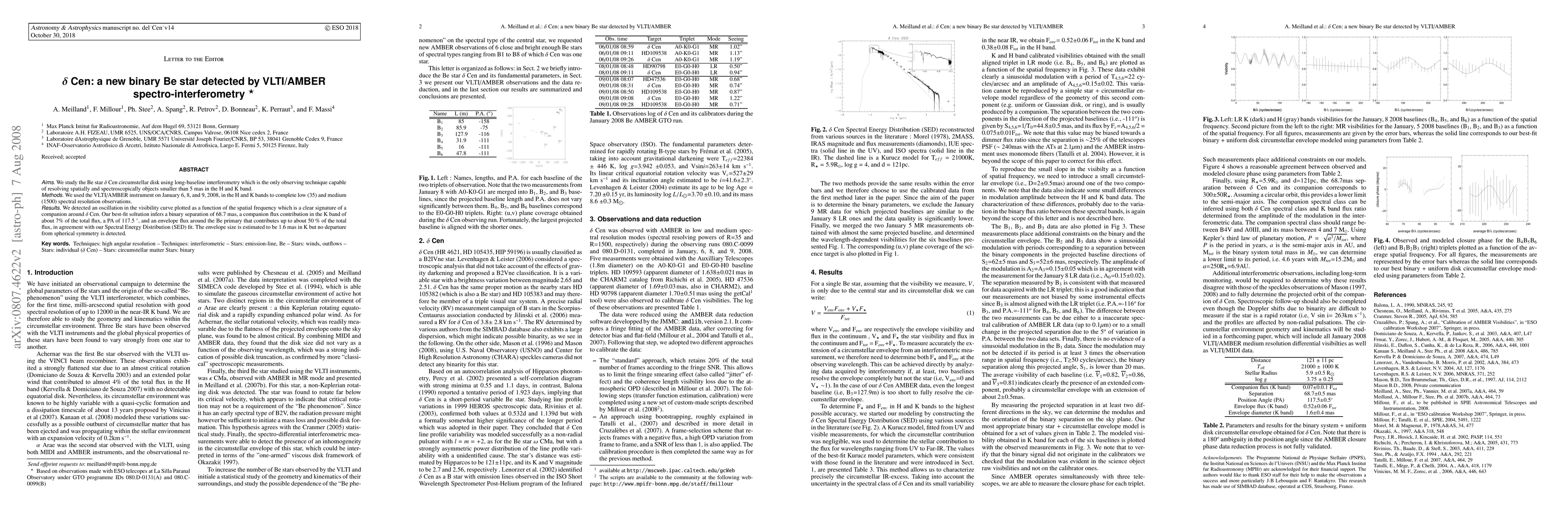 The research utilized VLTI/AMBER to study the Be star delta Cen's circumstellar disk, revealing a companion star through visibility curve oscillations. The companion is inferred to be 68.7 mas away, contributing ~7% of the K-band flux, with a position angle of 117.5°. The study also found an envelope around the Be primary contributing up to 50% of the total flux, estimated at 1.6 mas in K, with no significant deviation from spherical symmetry.