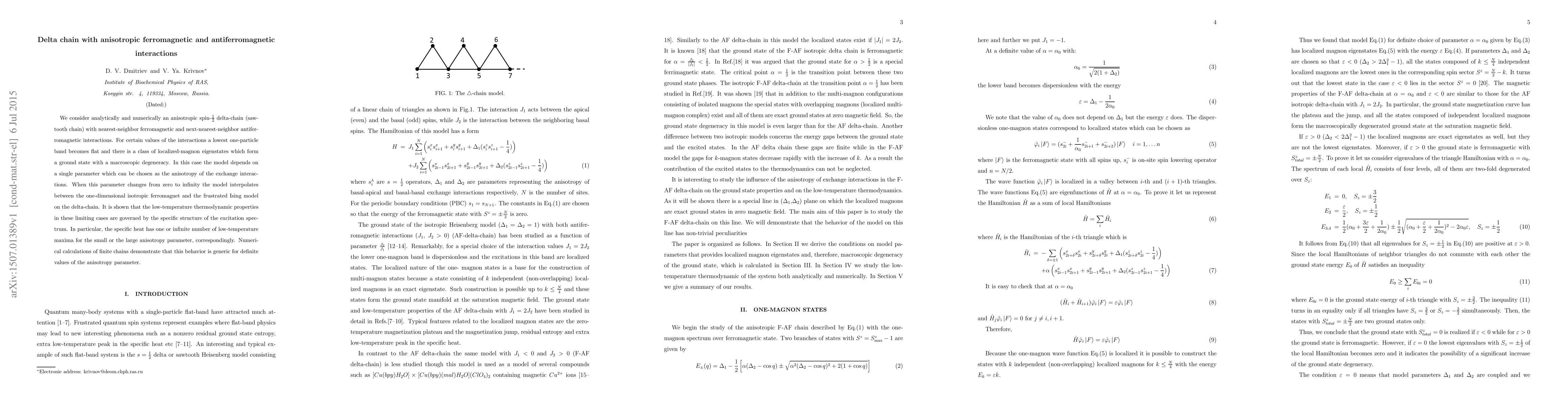 This paper investigates an anisotropic spin-1/2 delta-chain with ferromagnetic and antiferromagnetic interactions, revealing a flat lowest band and localized-magnon eigenstates forming a degenerate ground state. The model's thermodynamic properties, especially the specific heat, vary significantly with the anisotropy parameter, showing distinct low-temperature maxima.