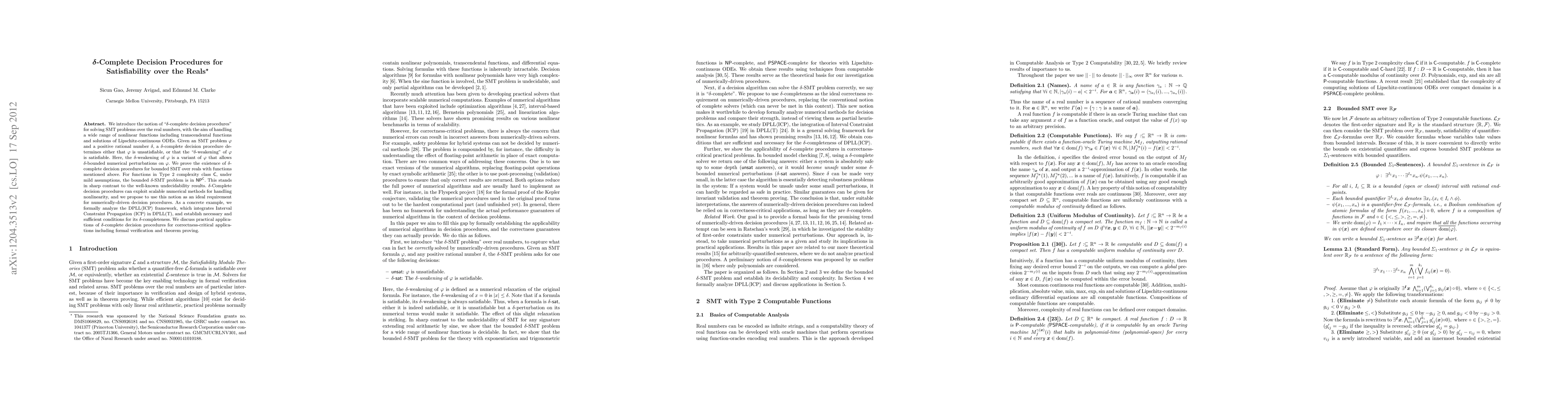 This paper introduces the concept of "\delta-complete decision procedures" for solving satisfiability problems over the reals, which can handle nonlinear functions and ODE solutions. It establishes the existence of such procedures for bounded SMT problems and discusses their practical applications in formal verification and theorem proving.