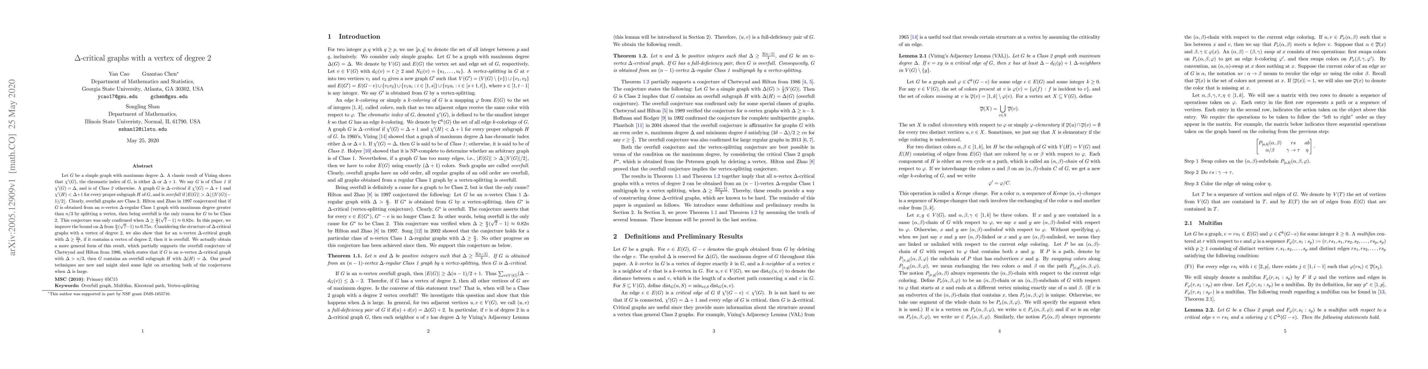 Researchers improved a bound on the maximum degree of an n-vertex $ abla$-critical graph with a vertex of degree 2, showing that if it contains such a vertex, it must be overfull.