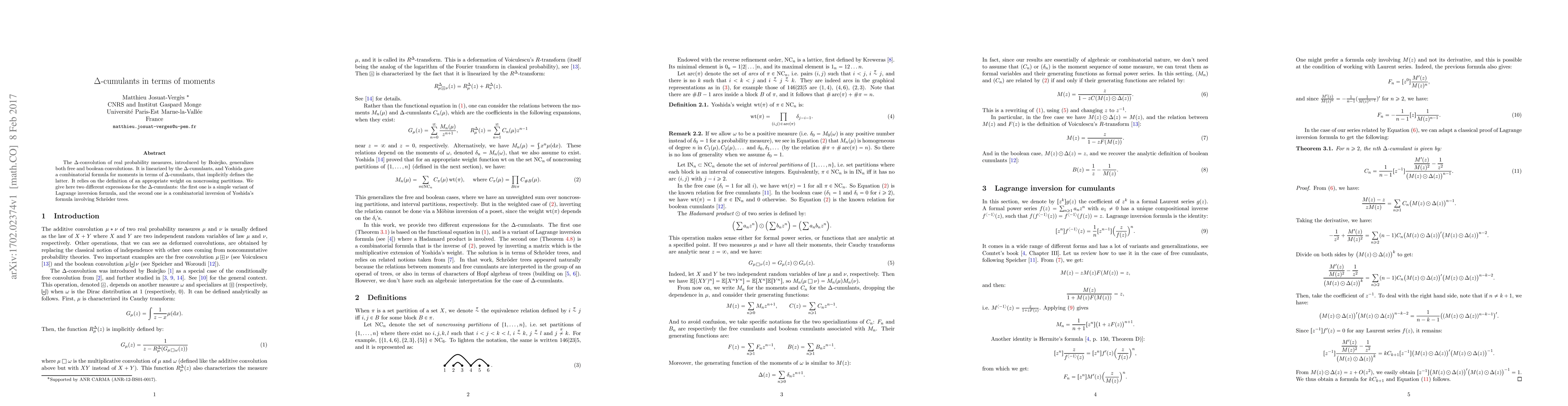 This paper presents two distinct expressions for \Delta-cumulants, which generalize both free and boolean convolutions. The first expression uses a variant of the Lagrange inversion formula, while the second involves a combinatorial inversion based on Schr\"oder trees.