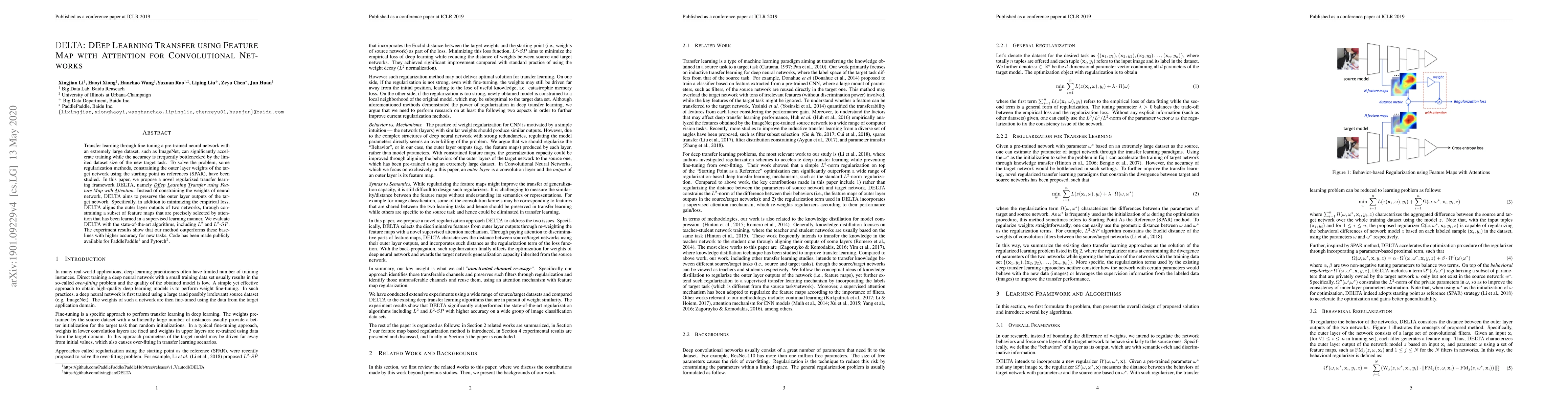 Transfer learning through fine-tuning a pre-trained neural network with an extremely large dataset, such as ImageNet, can significantly accelerate training while the accuracy is frequently bottlenecked by the limited dataset size of the new target task. To solve the problem, some regularization methods, constraining the outer layer weights of the target network using the starting point as references (SPAR), have been studied. In this paper, we propose a novel regularized transfer learning framework DELTA, namely DEep Learning Transfer using Feature Map with Attention. Instead of constraining the weights of neural network, DELTA aims to preserve the outer layer outputs of the target network. Specifically, in addition to minimizing the empirical loss, DELTA intends to align the outer layer outputs of two networks, through constraining a subset of feature maps that are precisely selected by attention that has been learned in an supervised learning manner. We evaluate DELTA with the state-of-the-art algorithms, including L2 and L2-SP. The experiment results show that our proposed method outperforms these baselines with higher accuracy for new tasks.