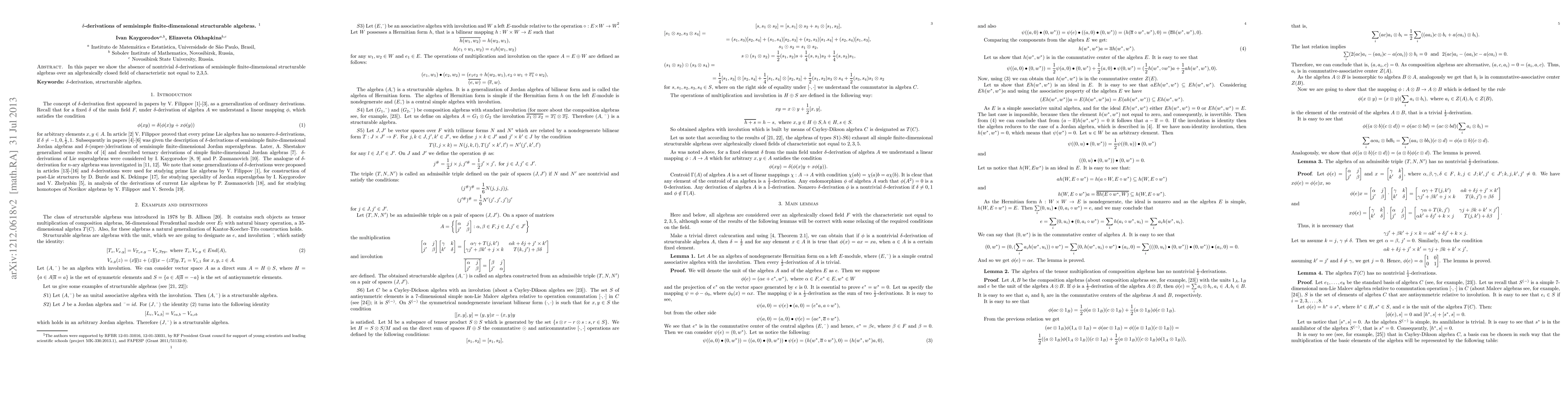 Summary: This paper presents a comprehensive description of all \(\delta\)-derivations in semisimple finite-dimensional structurable algebras over an algebraically closed field, excluding characteristics 2, 3, and 5. The findings detail the structural properties and implications of these derivations within the given algebraic framework.