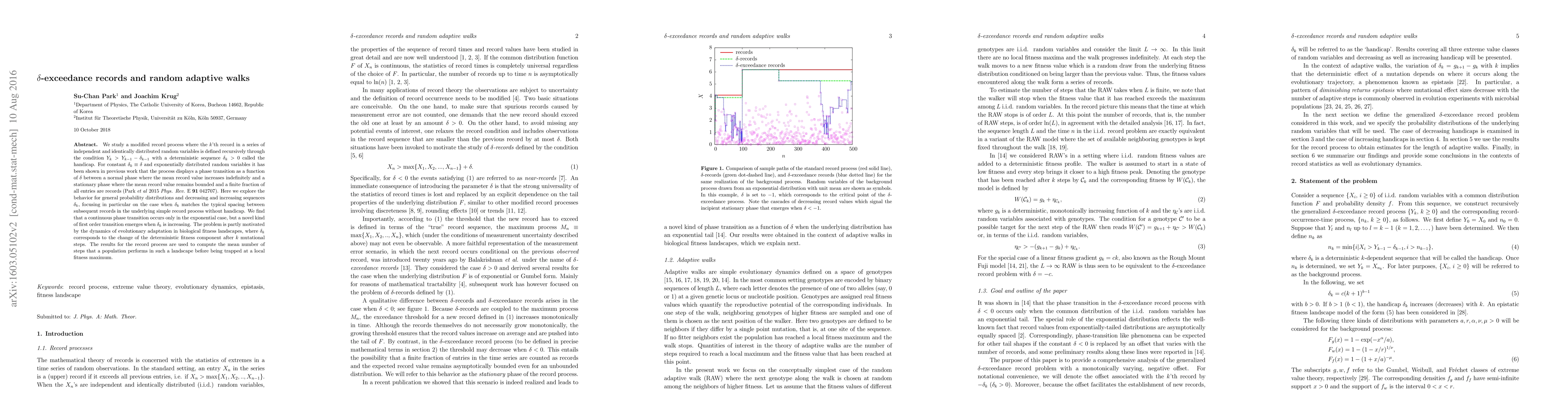 This research explores a modified record process with a handicap, finding phase transitions based on the handicap sequence's nature. A continuous transition occurs with constant, exponential handicaps, but a first-order transition emerges with increasing handicaps. The study applies to evolutionary adaptation in fitness landscapes, calculating mean population steps before being trapped at a maximum.