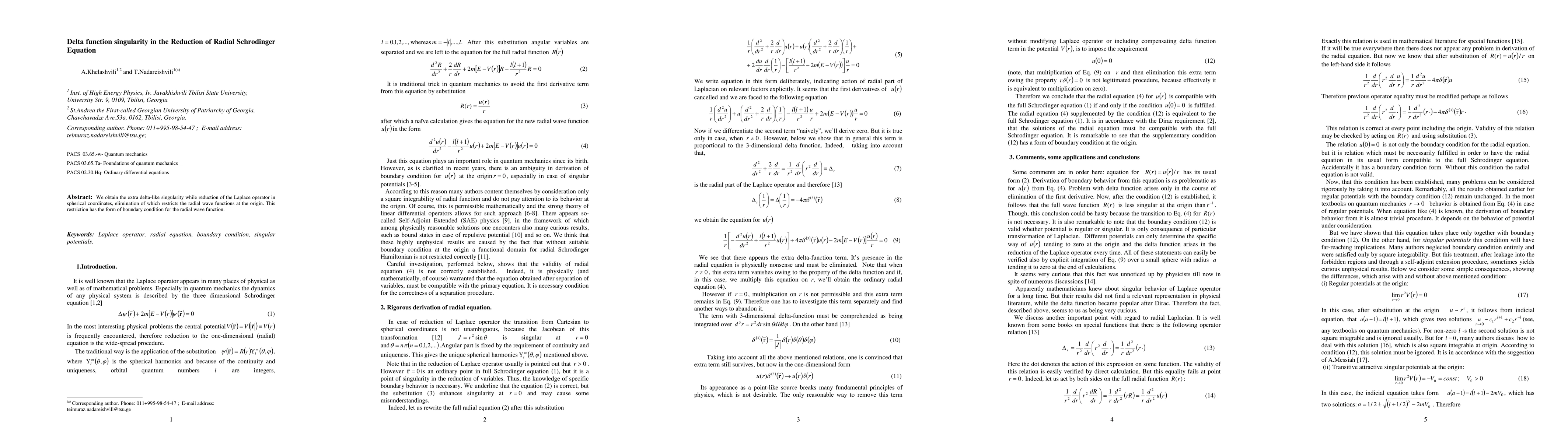 A study on the reduction of the Laplace operator in spherical coordinates reveals an extra delta-like singularity at the origin of radial wave functions, with a boundary condition restriction to eliminate it.