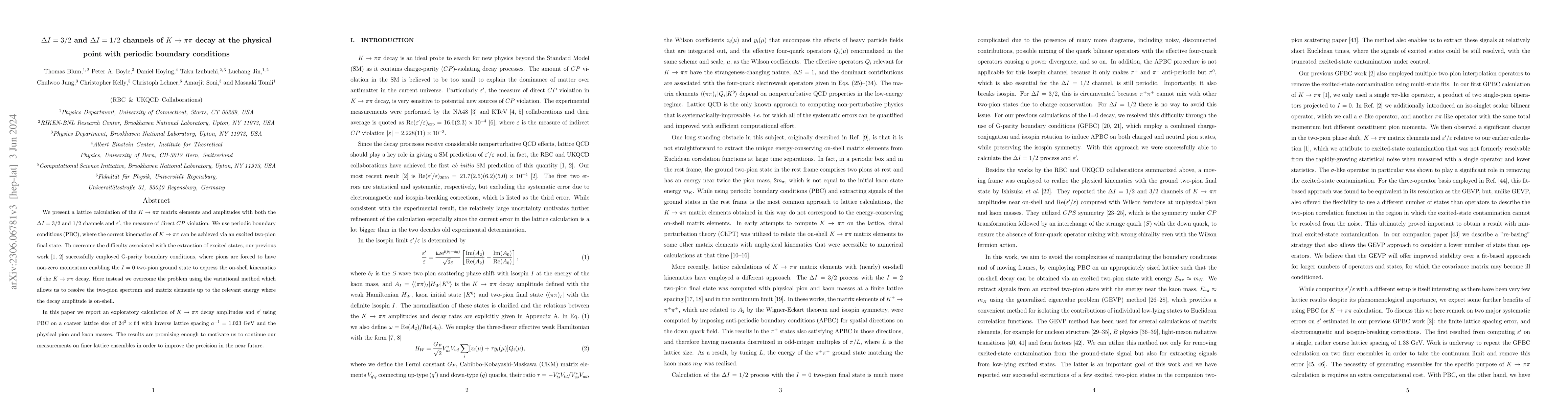 We present a lattice calculation of the $K\to\pi\pi$ matrix elements and amplitudes with both the $\Delta I = 3/2$ and 1/2 channels and $\varepsilon'$, the measure of direct $CP$ violation. We use periodic boundary conditions (PBC), where the correct kinematics of $K\to\pi\pi$ can be achieved via an excited two-pion final state. To overcome the difficulty associated with the extraction of excited states, our previous work \cite{Bai:2015nea,RBC:2020kdj} successfully employed G-parity boundary conditions, where pions are forced to have non-zero momentum enabling the $I=0$ two-pion ground state to express the on-shell kinematics of the $K\to\pi\pi$ decay. Here instead we overcome the problem using the variational method which allows us to resolve the two-pion spectrum and matrix elements up to the relevant energy where the decay amplitude is on-shell. In this paper we report an exploratory calculation of $K\to\pi\pi$ decay amplitudes and $\varepsilon'$ using PBC on a coarser lattice size of $24^3\times64$ with inverse lattice spacing $a^{-1}=1.023$ GeV and the physical pion and kaon masses. The results are promising enough to motivate us to continue our measurements on finer lattice ensembles in order to improve the precision in the near future.
