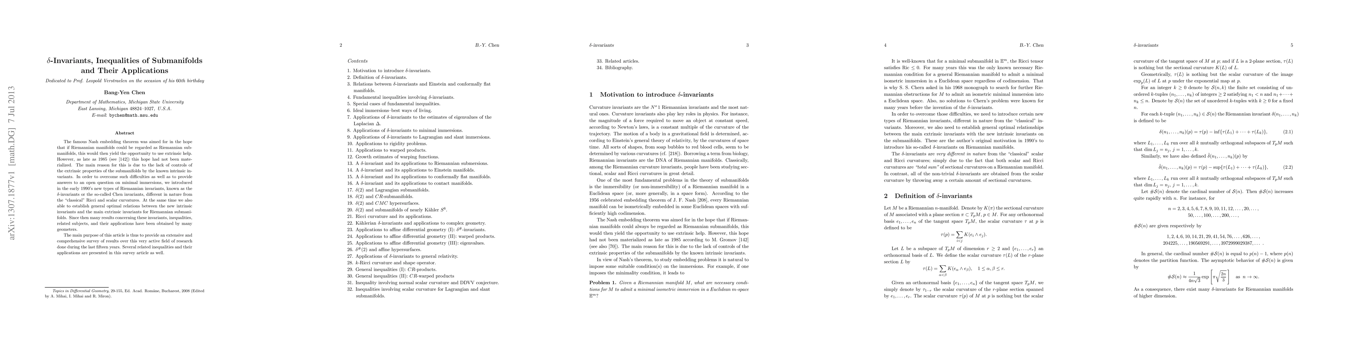 This paper surveys the development and applications of $\delta$-invariants, a new class of Riemannian invariants introduced to control the extrinsic properties of submanifolds, addressing limitations in the Nash embedding theorem. It also covers optimal relations between these invariants and their implications for minimal immersions and related inequalities.