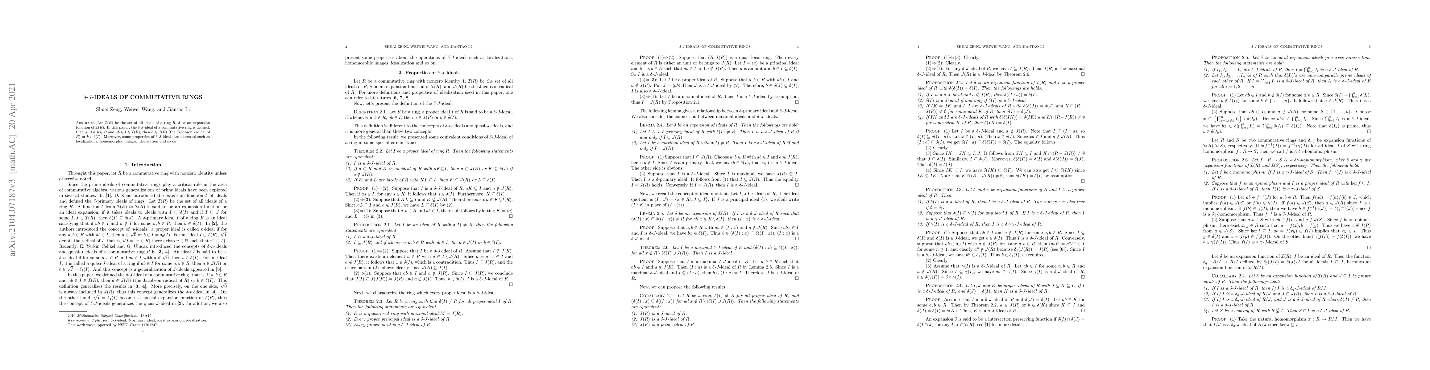 Let $\mathcal{I}(R)$ be the set of all ideals of a ring $R$, $\delta$ be an expansion function of $\mathcal{I}(R)$. In this paper, the $\delta$-$J$-ideal of a commutative ring is defined, that is, if $a, b\in R$ and $ab\in I\in \mathcal{I}(R)$, then $a\in J(R)$ (the Jacobson radical of $R$) or $b\in \delta(I)$. Moreover, some properties of $\delta$-$J$-ideals are discussed,such as localizations, homomorphic images, idealization and so on.