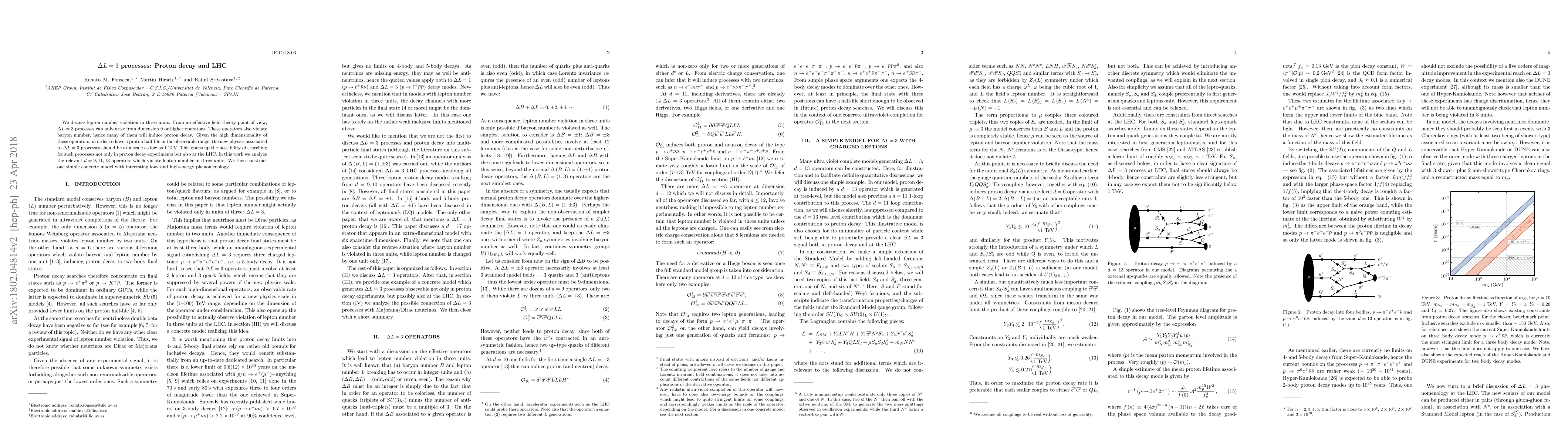We discuss lepton number violation in three units. From an effective field theory point of view, $\Delta L=3$ processes can only arise from dimension 9 or higher operators. These operators also violate baryon number, hence many of them will induce proton decay. Given the high dimensionality of these operators, in order to have a proton half-life in the observable range, the new physics associated to $\Delta L=3$ processes should be at a scale as low as 1 TeV. This opens up the possibility of searching for such processes not only in proton decay experiments but also at the LHC. In this work we analyze the relevant $d=9,11,13$ operators which violate lepton number in three units. We then construct one simple concrete model with interesting low- and high-energy phenomenology.