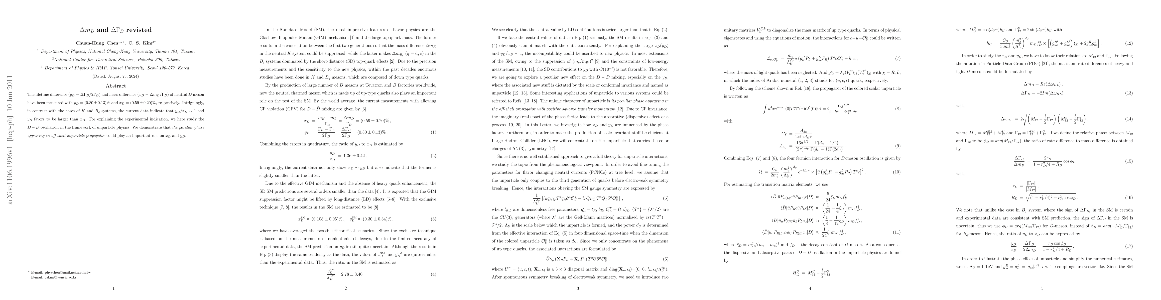 The lifetime difference ($y_D=\Delta\Gamma_D/2\Gamma_D$) and mass difference ($x_D=\Delta m_D/\Gamma_D$) of neutral $D$ meson have been measured with $y_D=(0.80\pm 0.13)%$ and $x_D=(0.59 \pm 0.20)%$, respectively. Intriguingly, in contrast with the cases of $K$ and $B_q$ systems, the current data indicate that $y_D/x_D \sim 1$ and $y_D$ favors to be larger than $x_D$. For explaining the experimental indication, we here study the $D-\bar D$ oscillation in the framework of unparticle physics. We demonstrate that {\it the peculiar phase appearing in off-shell unparticle propagator} could play an important role on $x_D$ and $y_D$.