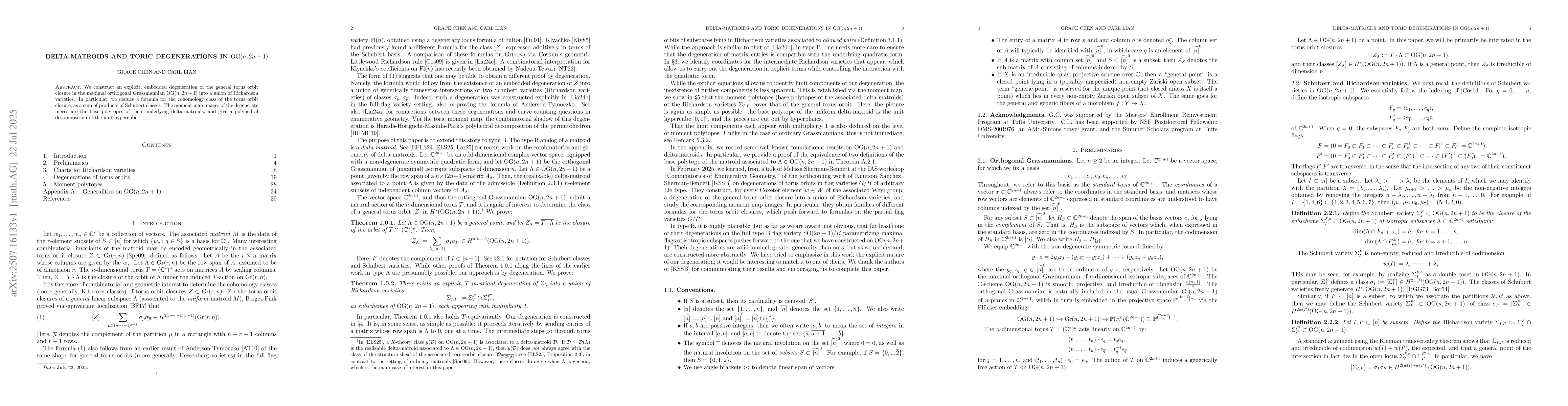 We construct an explicit, embedded degeneration of the general torus orbit closure in the maximal orthogonal Grassmannian OG(n,2n+1) into a union of Richardson varieties. In particular, we deduce a formula for the cohomology class of the torus orbit closure, as a sum of products of Schubert classes. The moment map images of the degenerate pieces are the base polytopes of their underlying delta-matroids, and give a polyhedral decomposition of the unit hypercube.
