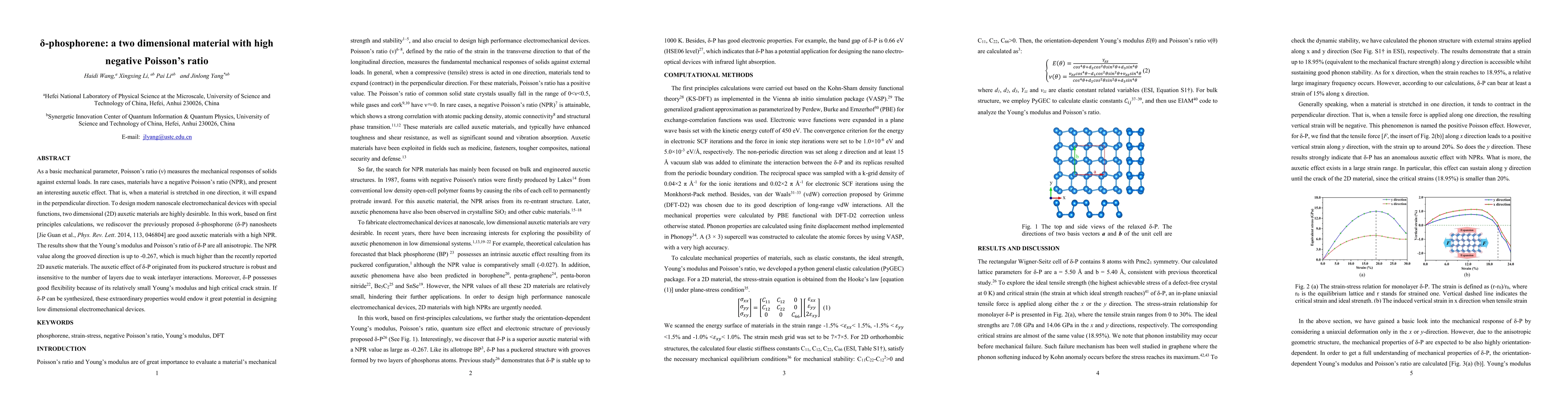 This paper reports that δ-phosphorene nanosheets exhibit a high negative Poisson's ratio (NPR) of -0.267, making them highly desirable auxetic materials for nanoscale devices. The material's puckered structure and weak interlayer interactions contribute to its robust auxetic effect and flexibility.