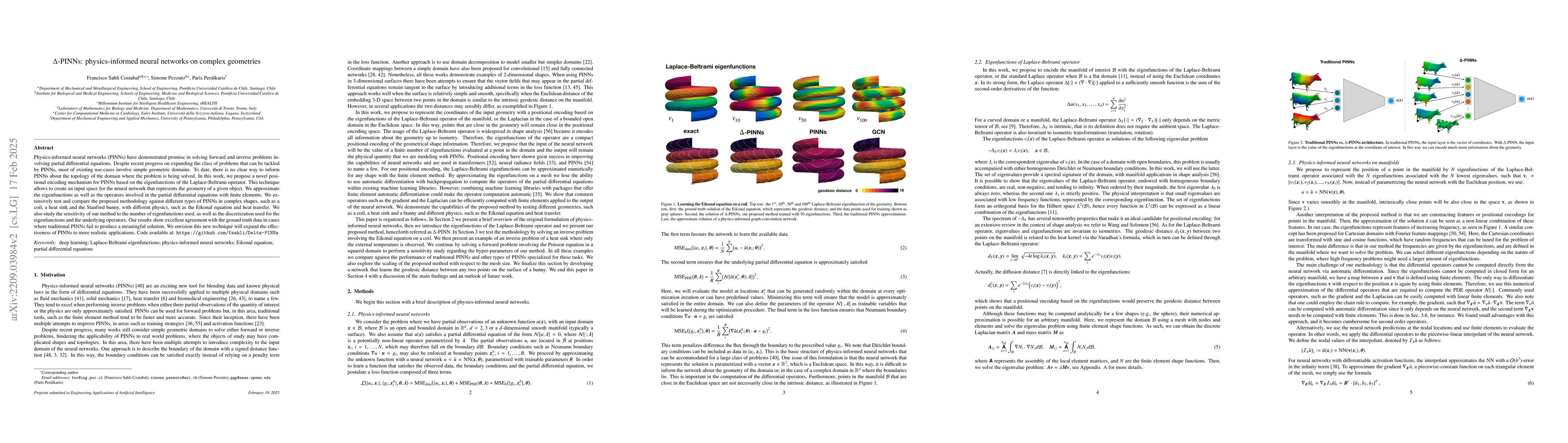 This paper proposes a novel positional encoding mechanism for physics-informed neural networks (PINNs) to handle complex geometries by using eigenfunctions of the Laplace-Beltrami operator. The method shows superior performance compared to traditional PINNs in solving problems in complex shapes, demonstrating its potential to expand the applicability of PINNs.