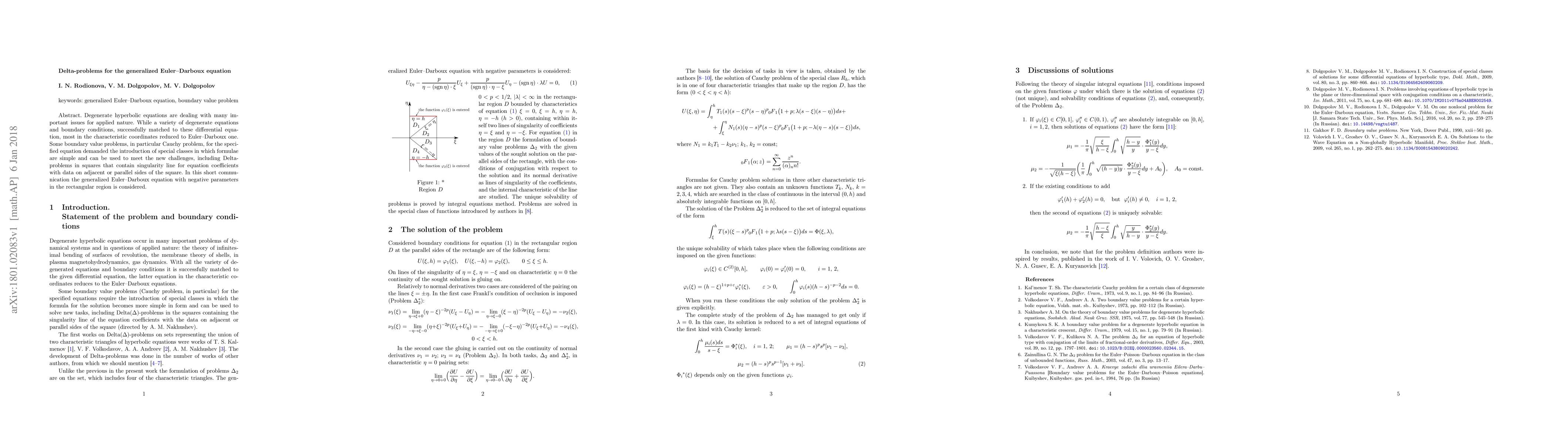 This paper explores the Delta-problems for the generalized Euler-Darboux equation in rectangular regions, focusing on degenerate hyperbolic equations and their boundary conditions, particularly addressing the Cauchy problem and singularities within the equation's coefficient lines.