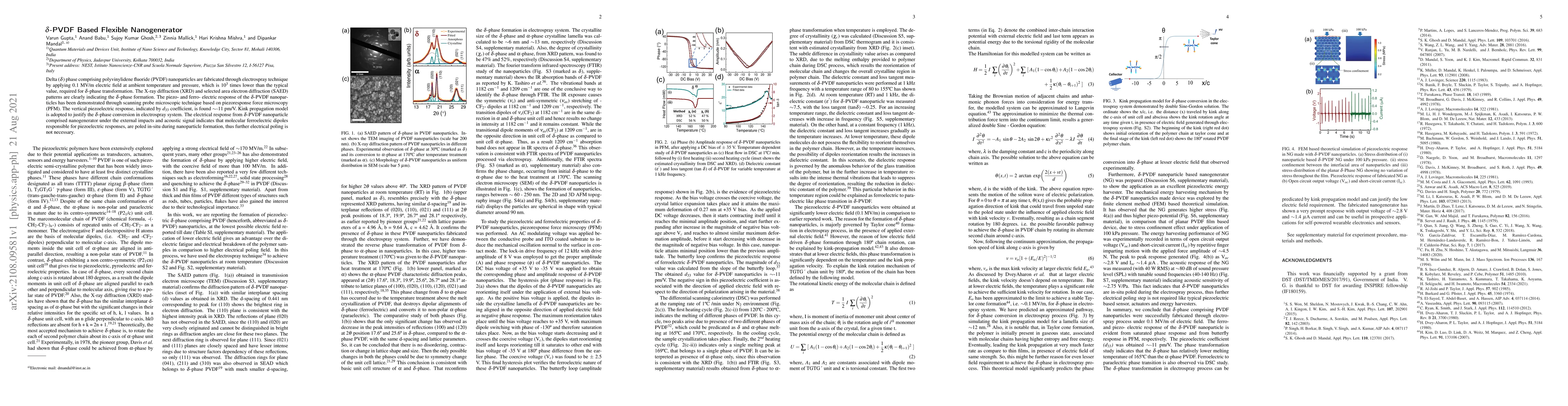 This paper details the fabrication of $\delta$-phase polyvinylidene fluoride (PVDF) nanoparticles via electrospray technique under a significantly lower electric field, demonstrating their piezo- and ferroelectric properties through PFM. The study shows that these nanoparticles can function as a flexible nanogenerator without additional electrical poling.