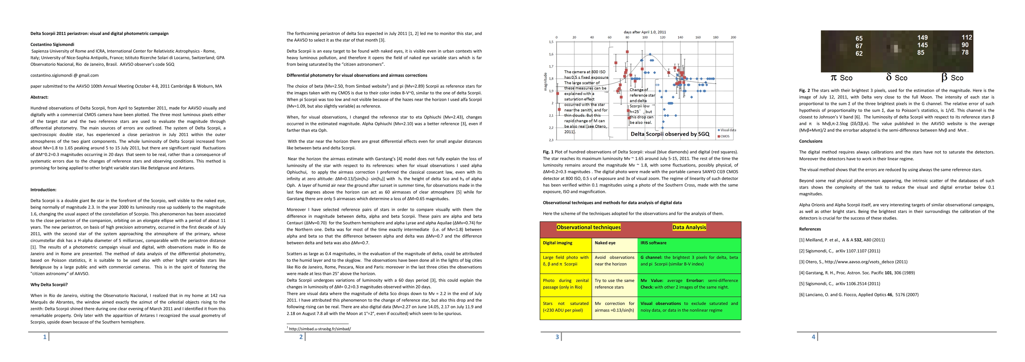 Hundred observations of Delta Scorpii, from April to September 2011, made for AAVSO visually and digitally with a commercial CMOS camera have been plotted. The three most luminous pixels either of the target star and the two reference stars are used to evaluate the magnitude through differential photometry. The main sources of errors are outlined. The system of Delta Scorpii, a spectroscopic double star, has experienced a close periastron in July 2011 within the outer atmospheres of the two giant components. The whole luminosity of Delta Scorpii increased from about Mv=1.8 to 1.65 peaking around 5 to 15 July 2011, but there are significant rapid fluctuations of 0.2-0.3 magnitudes occuring in 20 days that seem to be real, rather than a consequence of systematic errors due to the changes of reference stars and observing conditions. This method is promising for being applied to other bright variable stars like Betelgeuse and Antares.