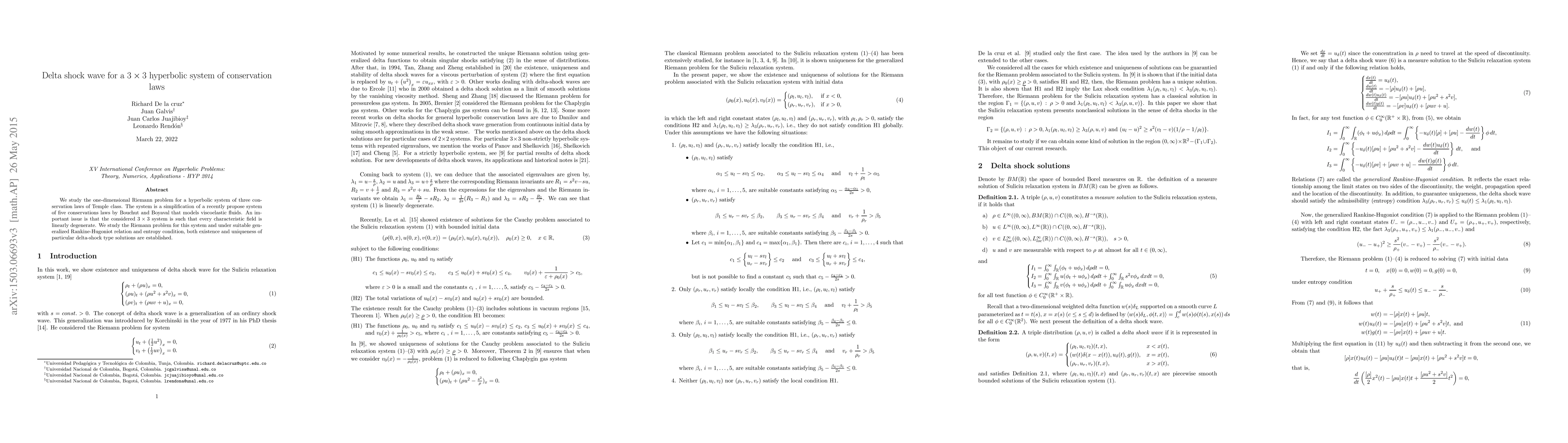 This paper investigates the one-dimensional Riemann problem for a hyperbolic system of three conservation laws, focusing on delta-shock wave solutions. It establishes the existence and uniqueness of such solutions under generalized Rankine-Hugoniot conditions and entropy criteria, despite the linear degeneracy of all characteristic fields.