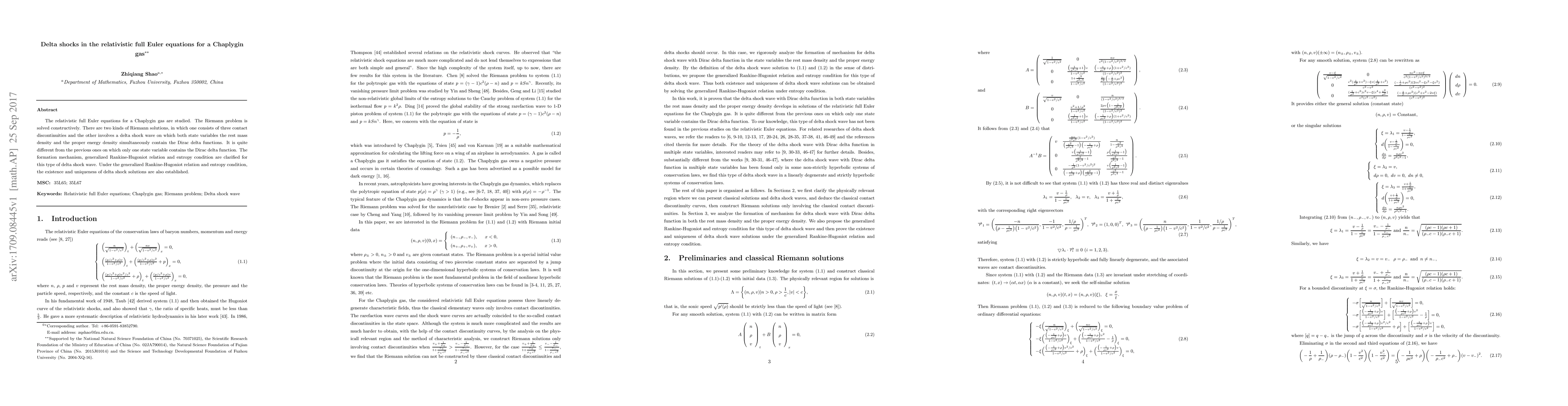 The relativistic full Euler equations for a Chaplygin gas are studied. The Riemann problem is solved constructively. There are two kinds of Riemann solutions, in which one consists of three contact discontinuities and the other involves a delta shock wave on which both state variables the rest mass density and the proper energy density simultaneously contain the Dirac delta functions. It is quite different from the previous ones on which only one state variable contains the Dirac delta function. The formation mechanism, generalized Rankine-Hugoniot relation and entropy condition are clarified for this type of delta shock wave. Under the generalized Rankine-Hugoniot relation and entropy condition, the existence and uniqueness of delta shock solutions are also established.