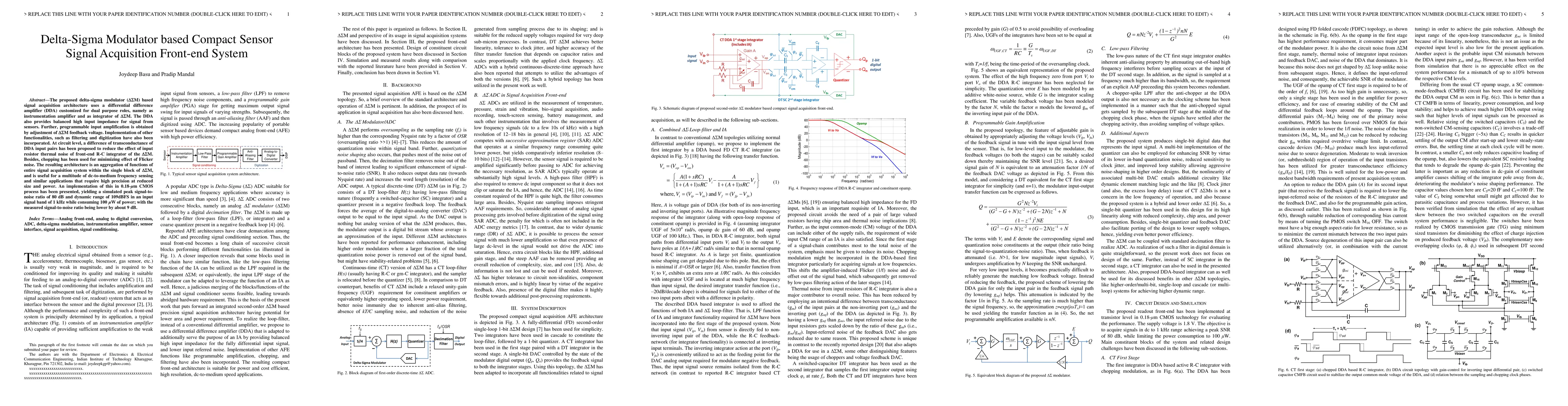 The proposed delta-sigma modulator ($\Delta\Sigma$M) based signal acquisition architecture uses a differential difference amplifier (DDA) customized for dual purpose roles, namely as instrumentation amplifier and as integrator of $\Delta\Sigma$M. The DDA also provides balanced high input impedance for signal from sensors. Further, programmable input amplification is obtained by adjustment of $\Delta\Sigma$M feedback voltage. Implementation of other functionalities, such as filtering and digitization have also been incorporated. At circuit level, a difference of transconductance of DDA input pairs has been proposed to reduce the effect of input resistor thermal noise of front-end R-C integrator of the $\Delta\Sigma$M. Besides, chopping has been used for minimizing effect of Flicker noise. The resulting architecture is an aggregation of functions of entire signal acquisition system within the single block of $\Delta\Sigma$M, and is useful for a multitude of dc-to-medium frequency sensing and similar applications that require high precision at reduced size and power. An implementation of this in 0.18-$\mu$m CMOS process has been presented, yielding a simulated peak signal-to-noise ratio of 80 dB and dynamic range of 109dBFS in an input signal band of 1 kHz while consuming 100 $\mu$W of power; with the measured signal-to-noise ratio being lower by about 9 dB.